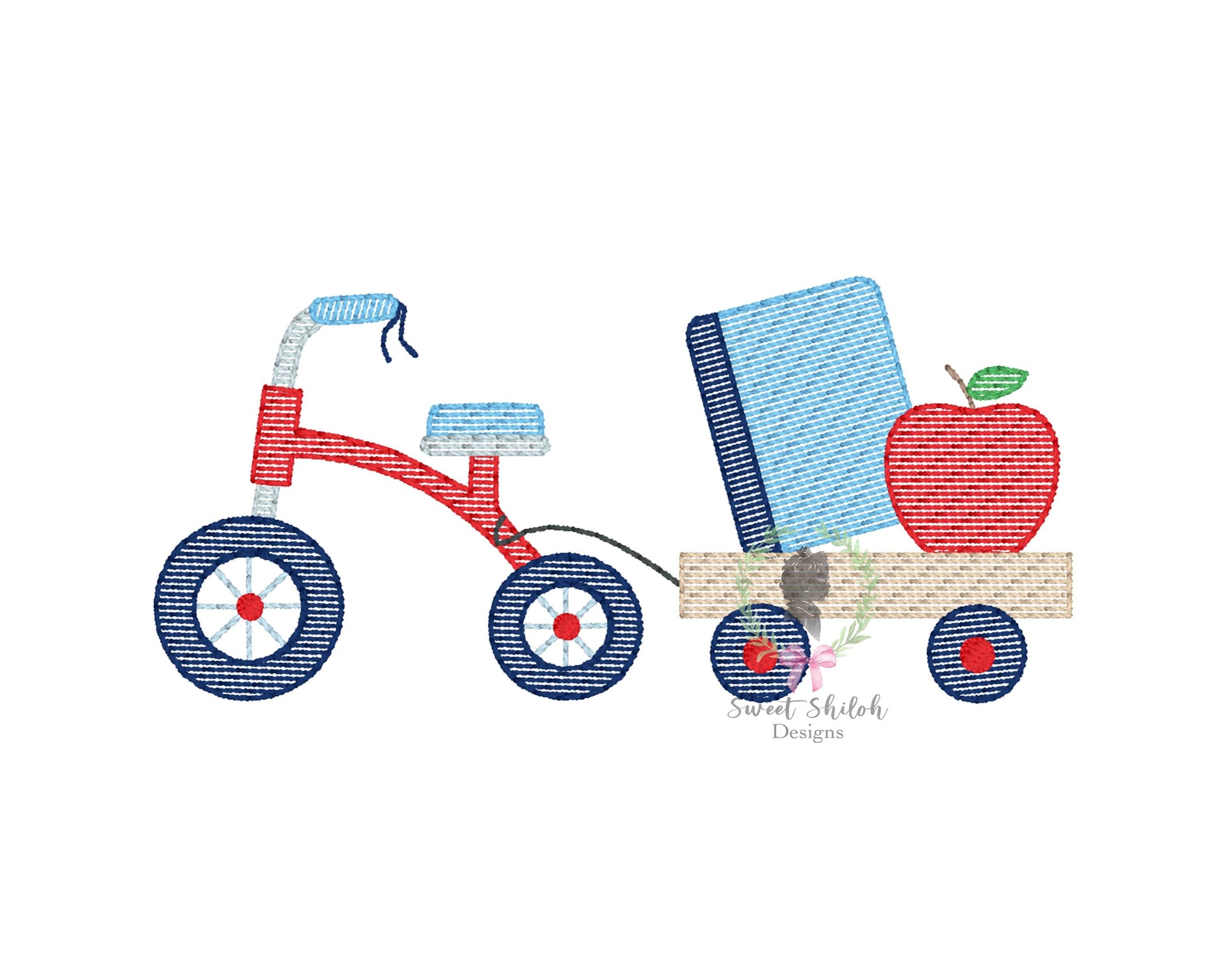 Design includes a sketch back to school tricycle with apples machine embroidery file. Fonts not included.