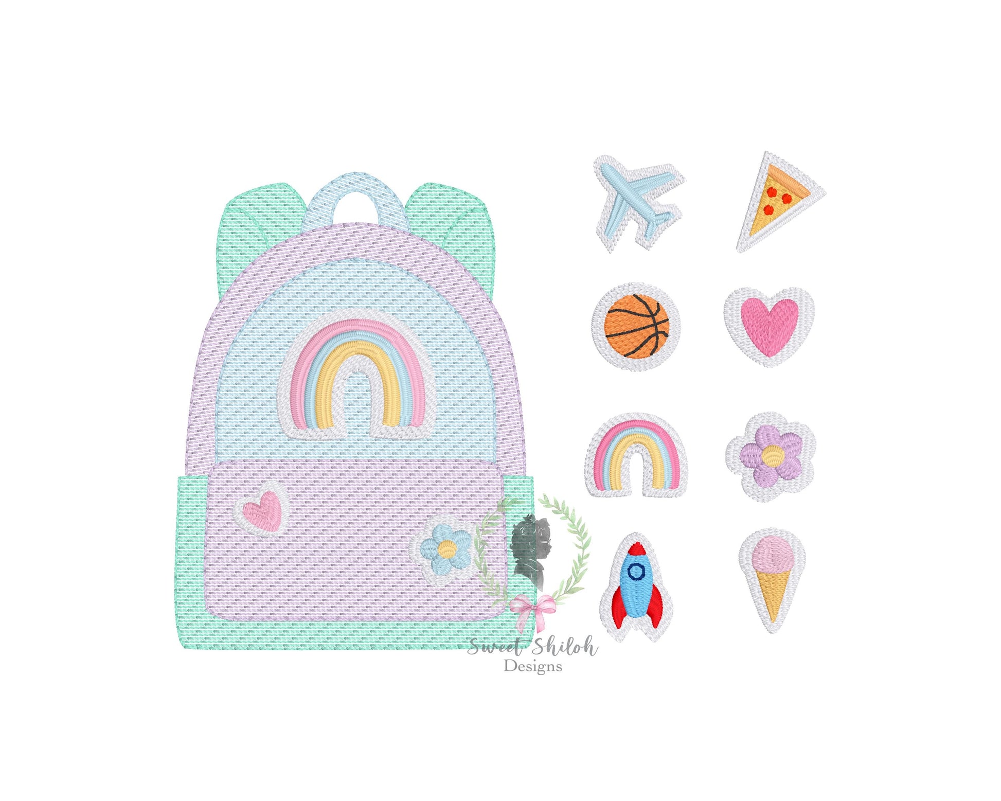 Customize your own backpack design! Design includes a sketch back to school backpack machine embroidery file. Included are 8 mini motif patches (as shown) in 3 different sizes to fit each backpack size. Fonts not included.