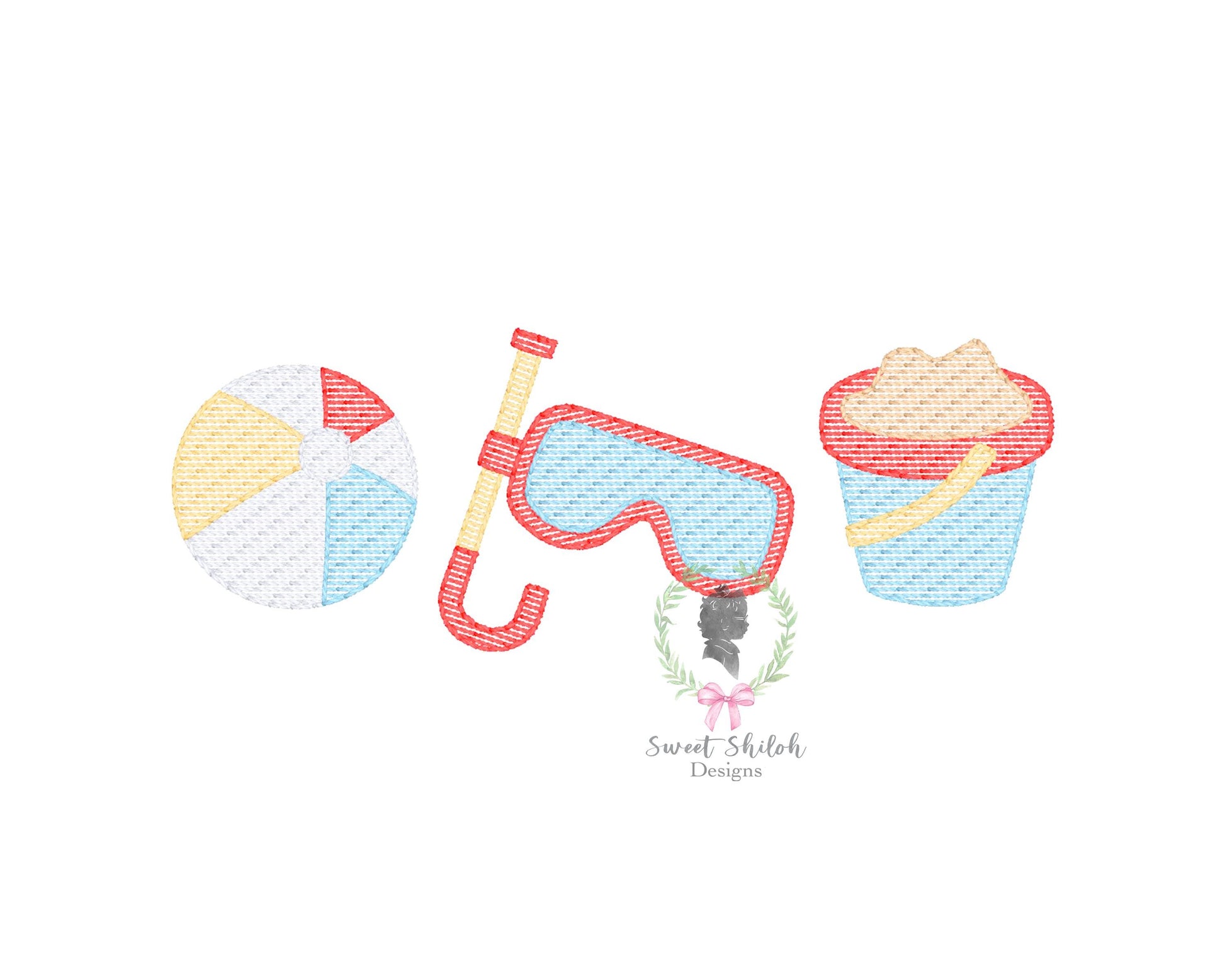 Design includes a sketch stitch beach toy trio (snorkel, beach ball and sand bucket) machine embroidery file. Font not included.
