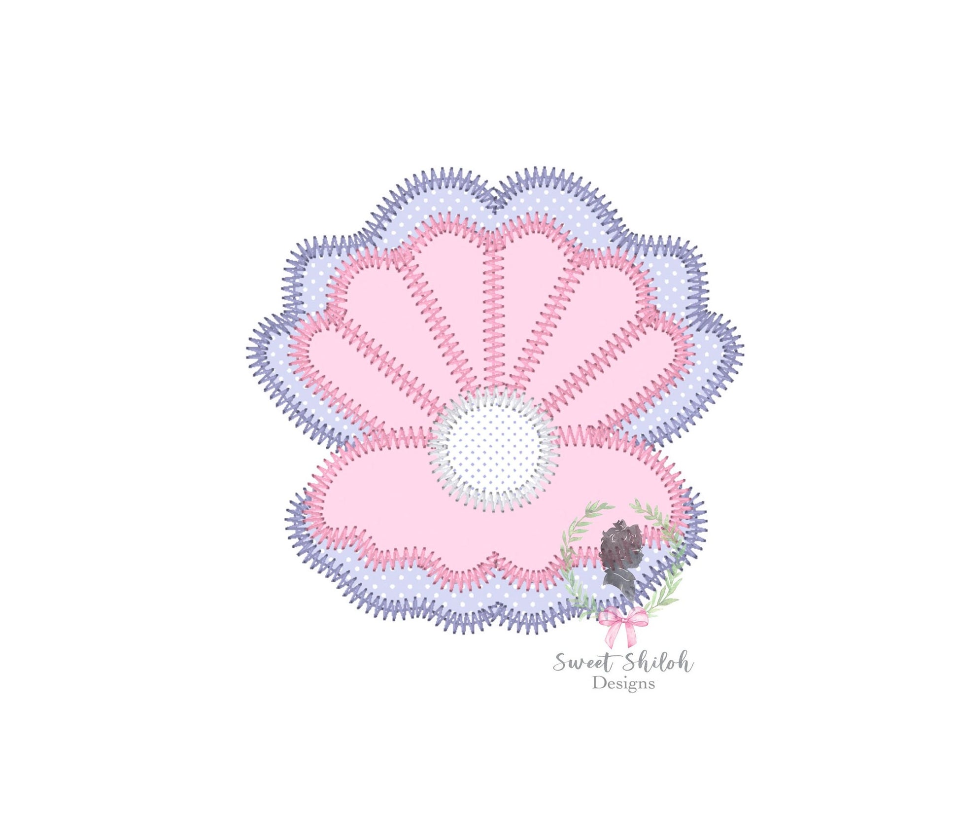 Design includes an appliqué zigzag stitch clamshell with pearl machine embroidery file. Font not included.