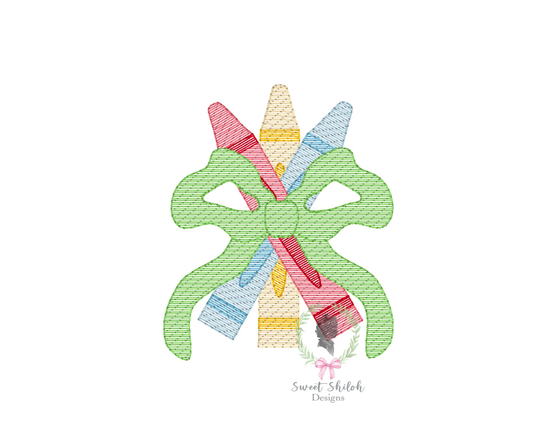 Design includes crayon trio with ribbon sketch machine embroidery file. Fonts not included.