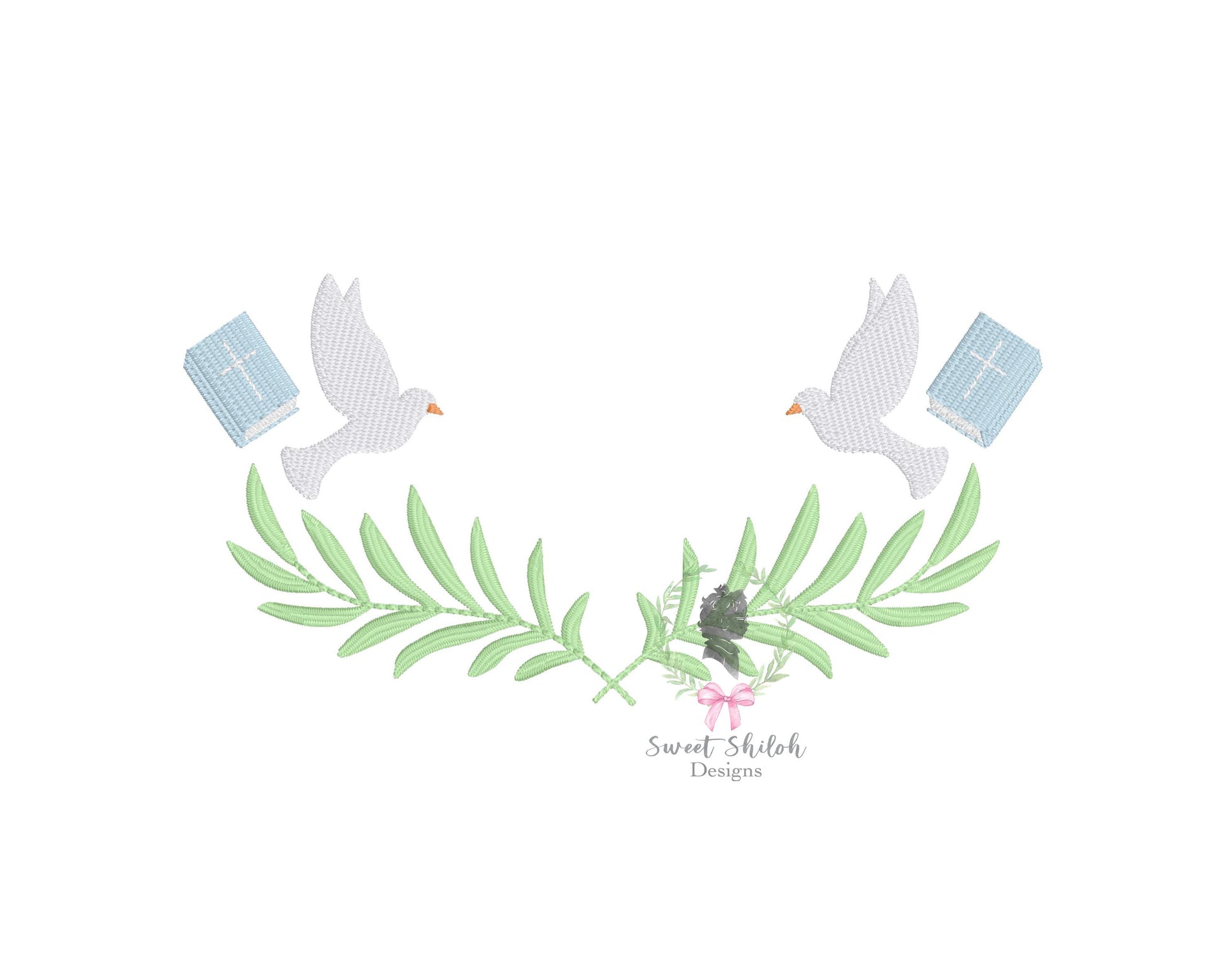 Design includes a Easter dove with bible and olive leaf laurel monogram frame machine embroidery file. Font not included.