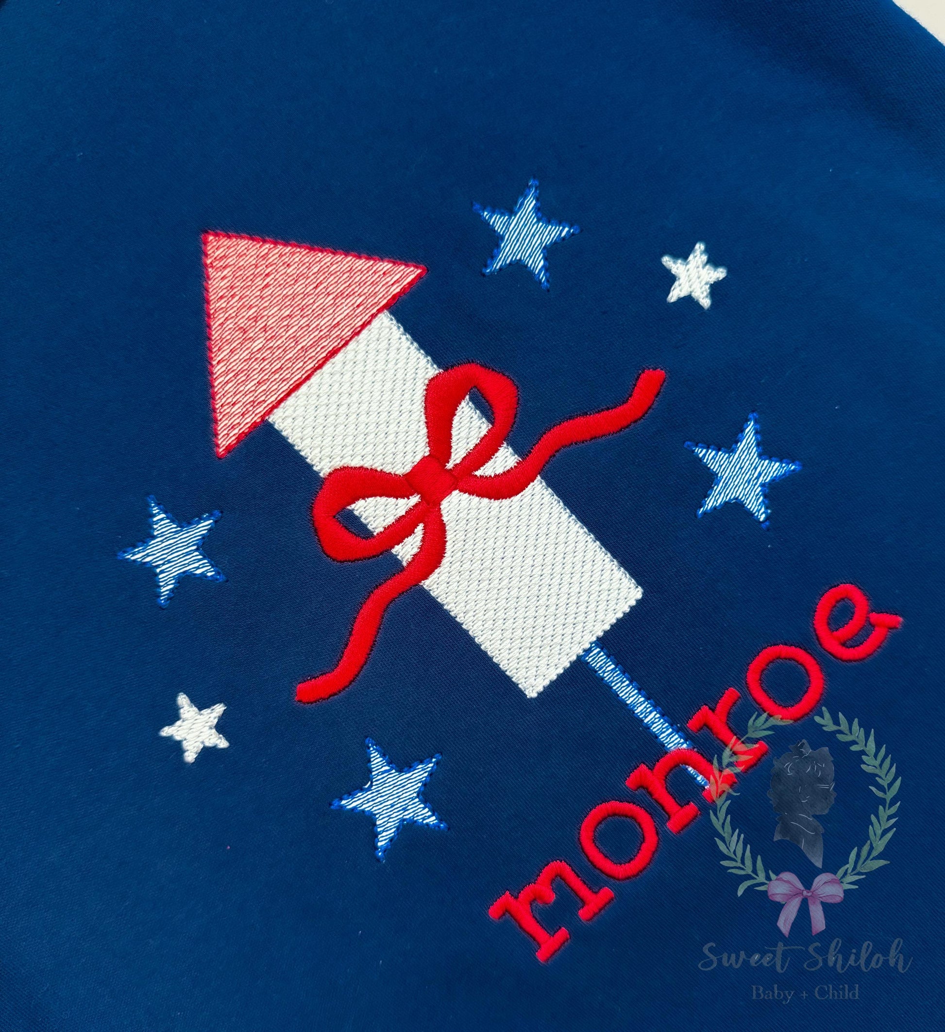 Design includes a sketch firework rocket with bow machine embroidery file. Fonts not included.