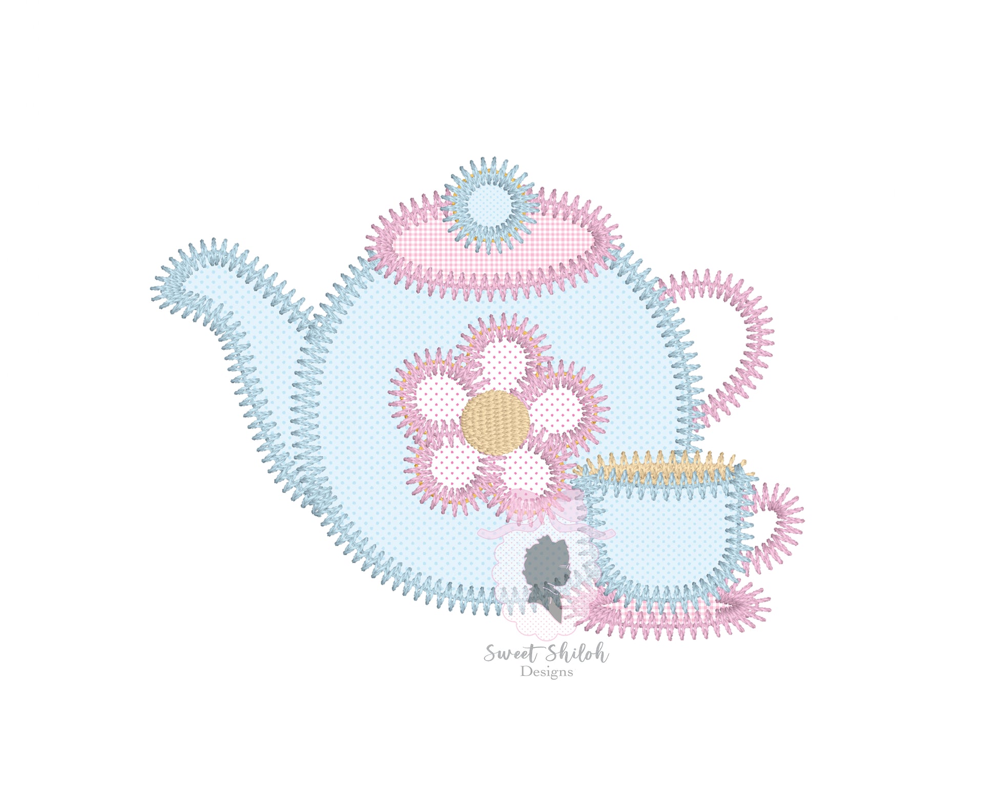 Design includes a zigzag tea set applique machine embroidery file. Font not included.