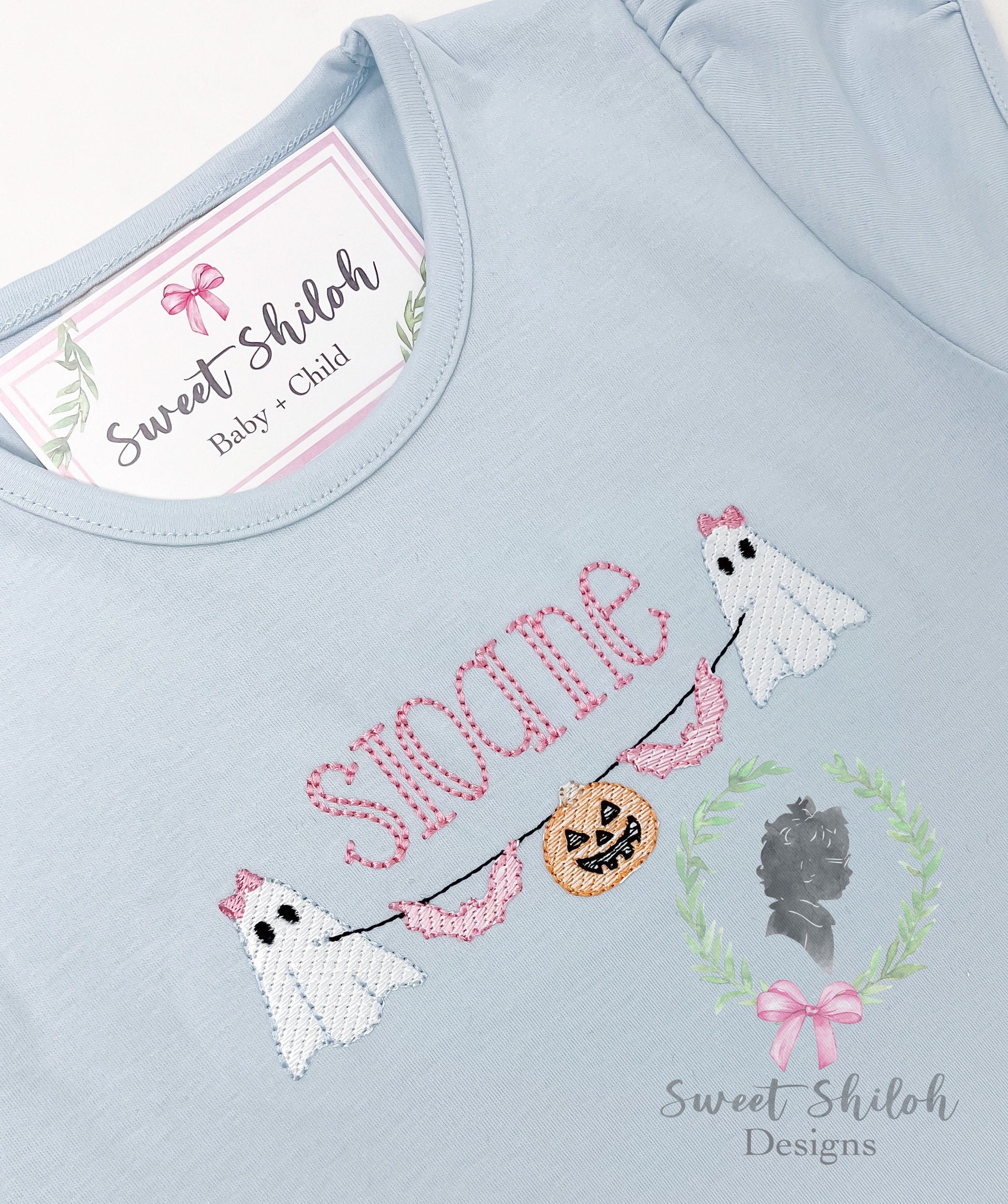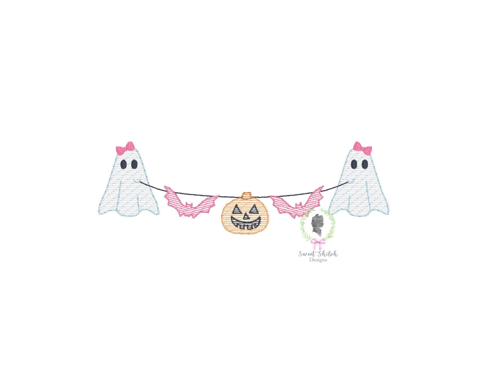 Design includes a Halloween ghost with bow sketch frame machine embroidery file.