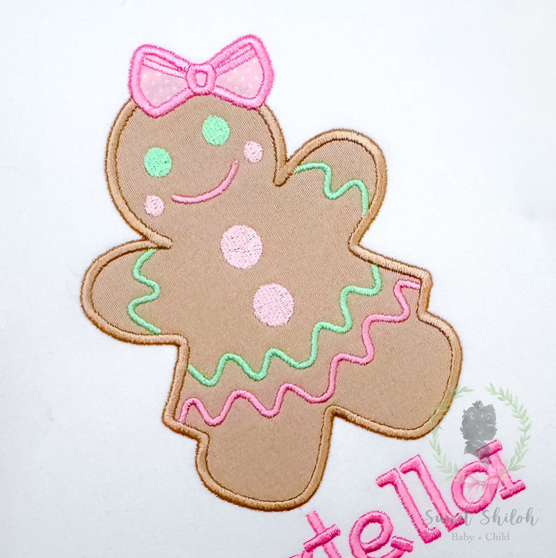Design includes a satin stitch Christmas gingerbread girl applique machine embroidery file. Font not included.