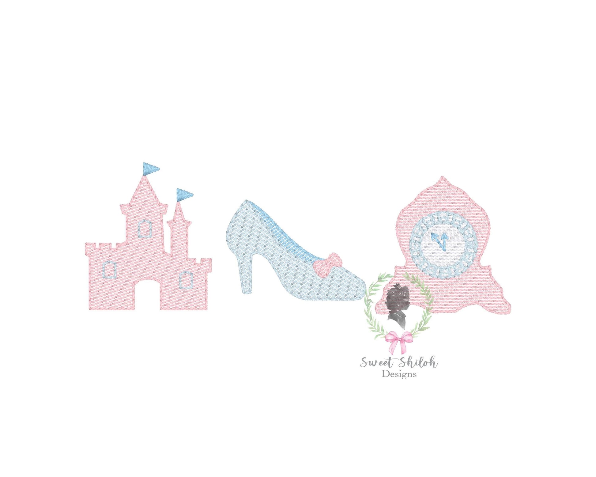 Design includes a sketch glass slipper princess trio machine embroidery file. Font not included.