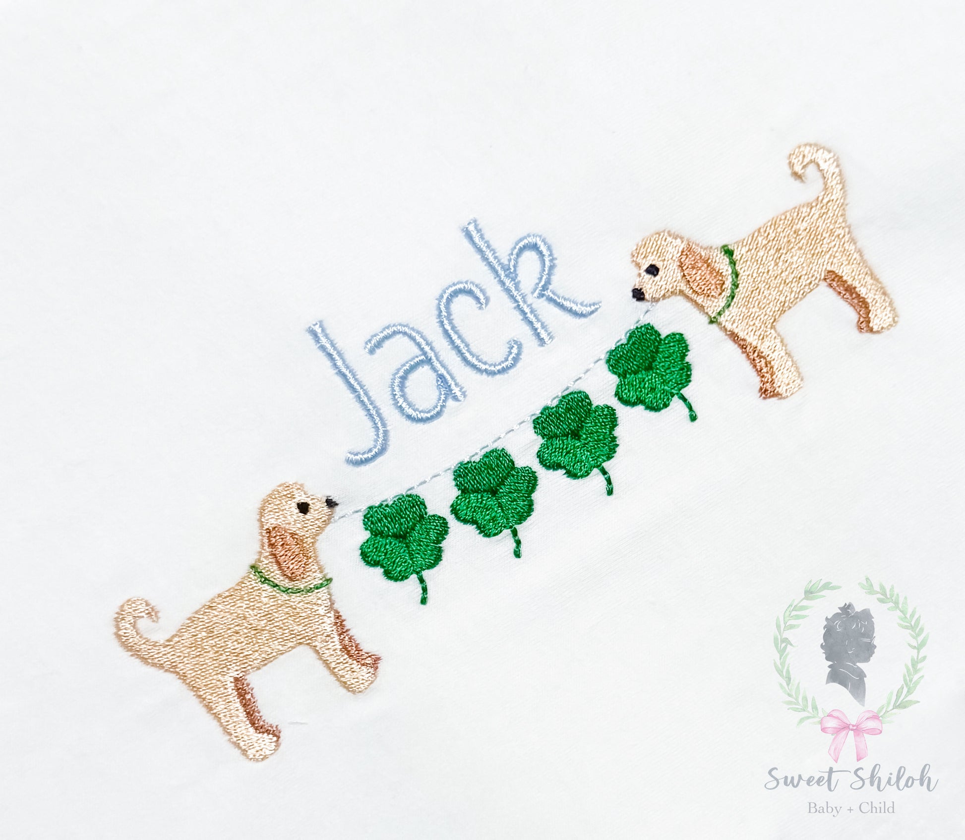 Design includes a fill St. Patrick's Day golden doodle puppy with shamrock bunting banner machine embroidery file. Font not included.