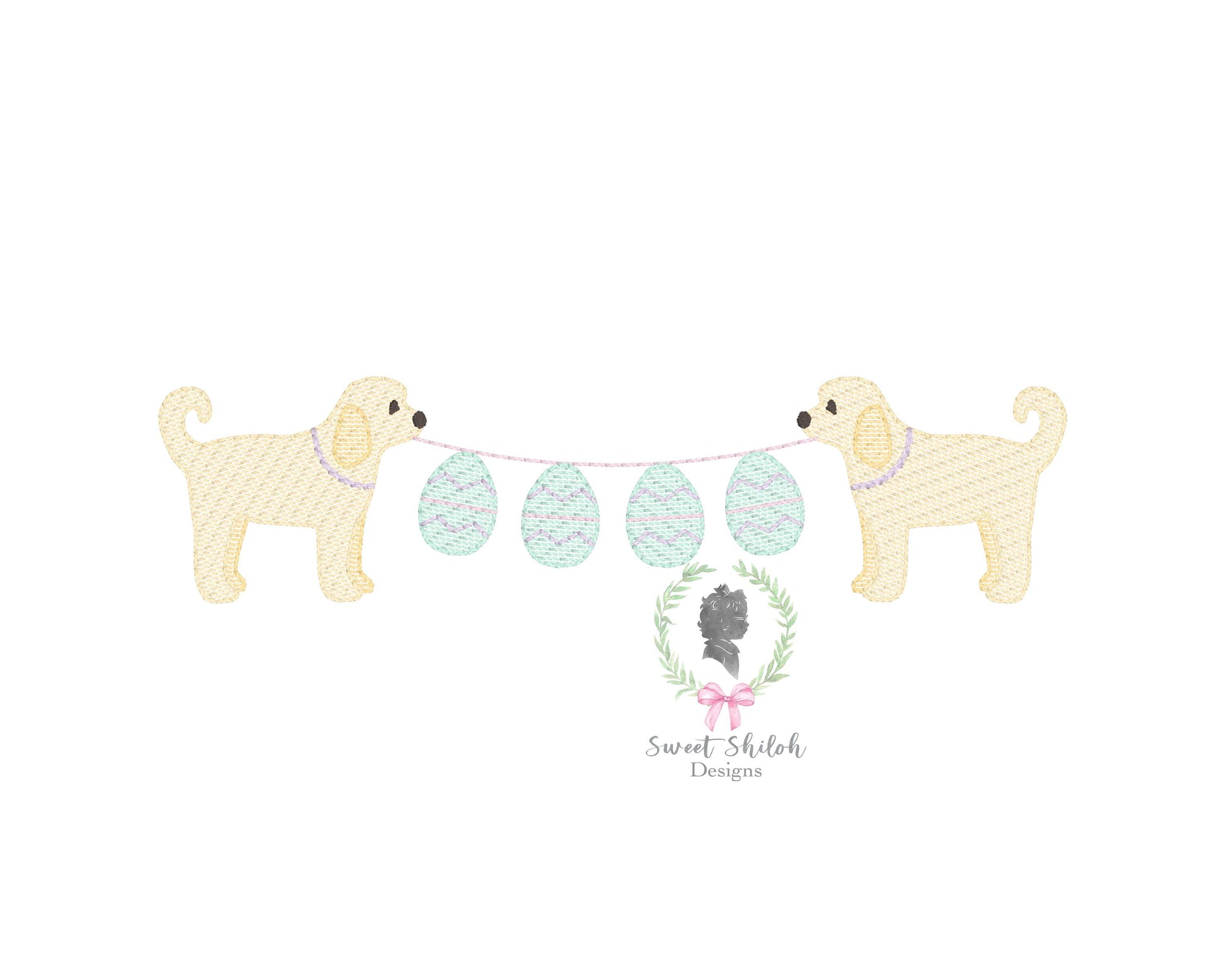 Design includes a sketch Easter goldendoodle puppy with Easter egg bunting machine embroidery file. Font not included.