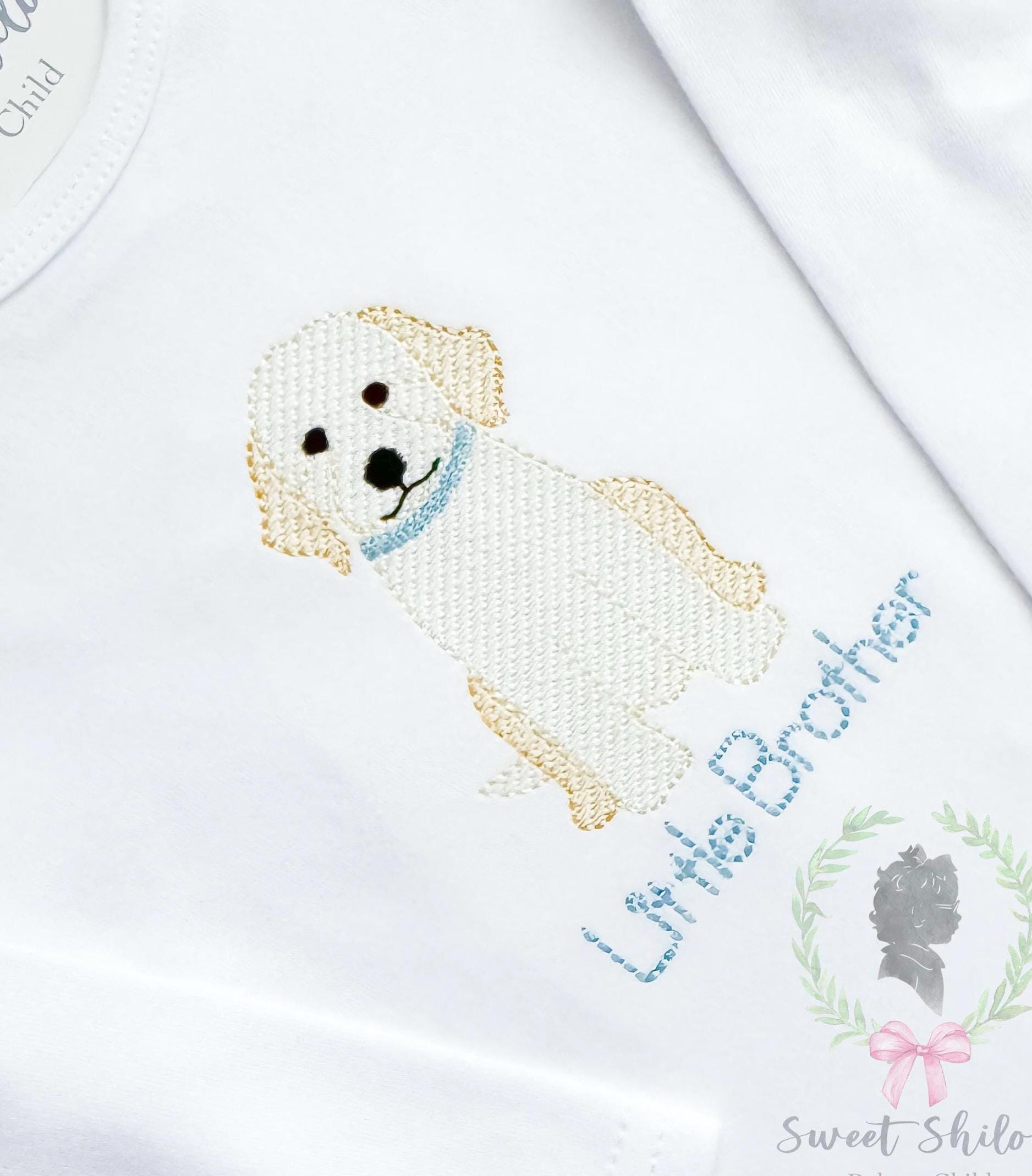 Design includes a sketch goldendoodle puppy with collar machine embroidery file. Font not included.