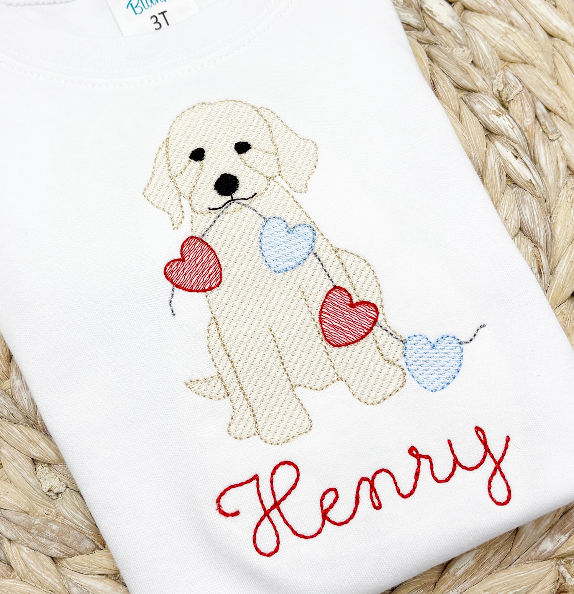 Design includes a sketch Valentine goldendoodle puppy with heart banner machine embroidery file. Font not included.