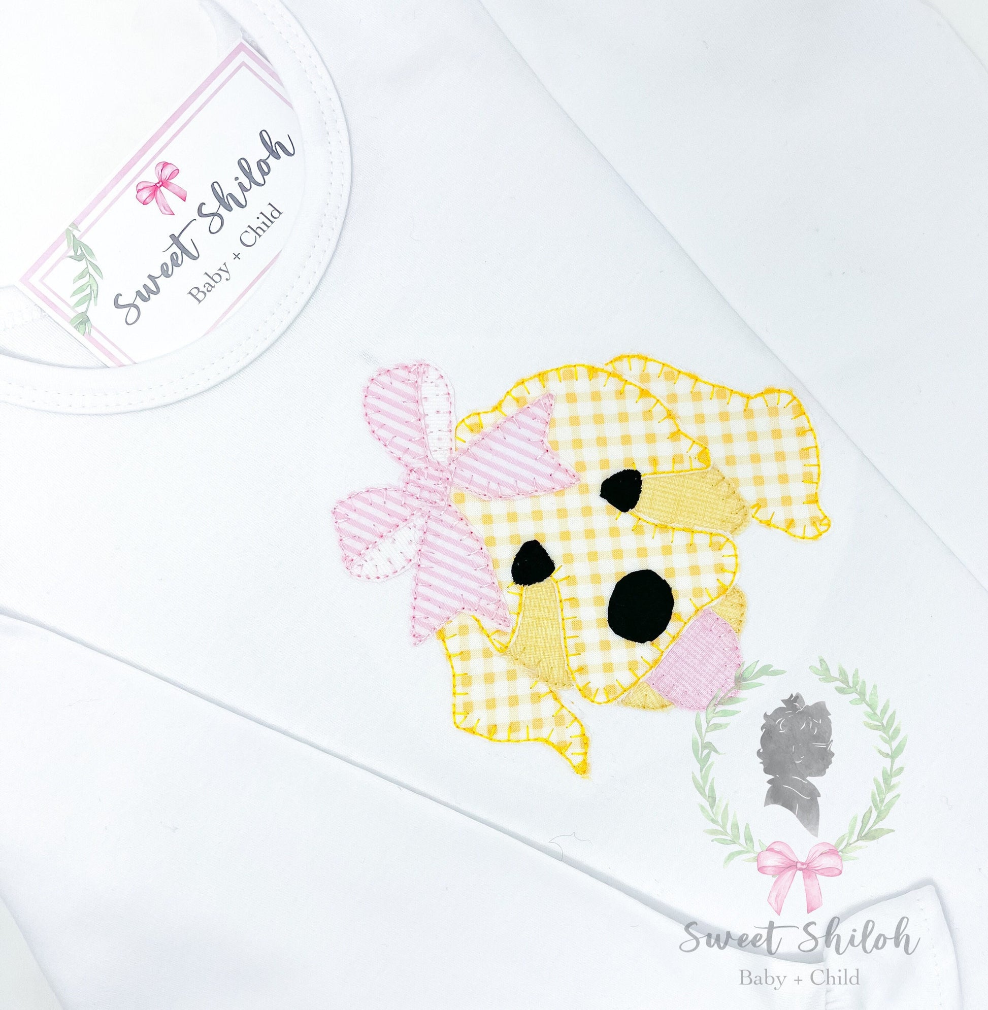 Design includes an appliqué golden doodle puppy dog with bow machine embroidery file.