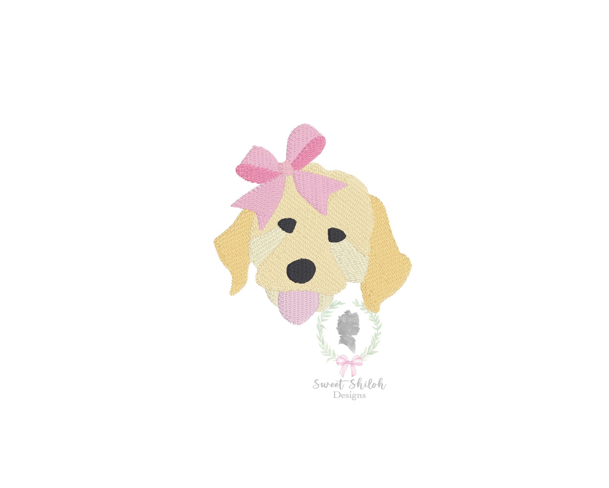 Design includes a mini fill golden doodle with bow puppy dog with bow machine embroidery file.