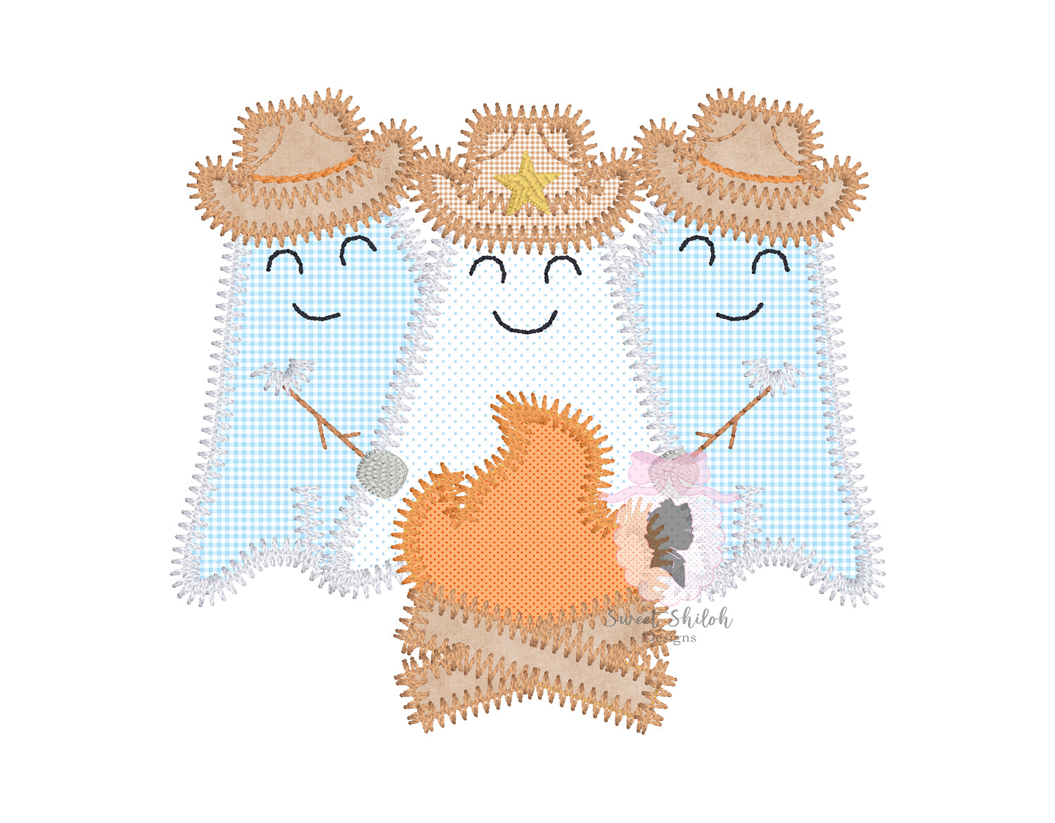Design includes a zigzag stitch Halloween cowboy ghost trio applique machine embroidery file. Fonts not included.