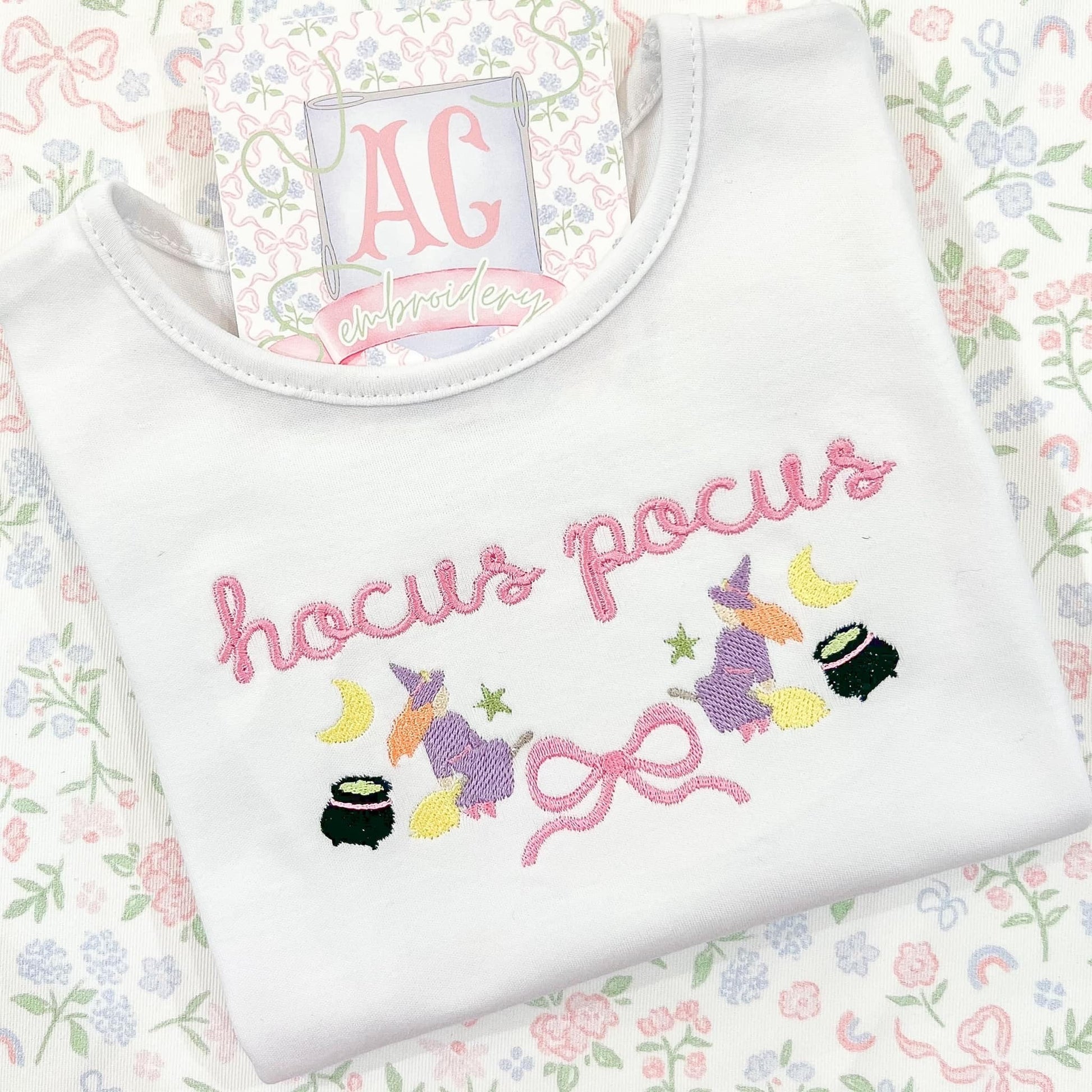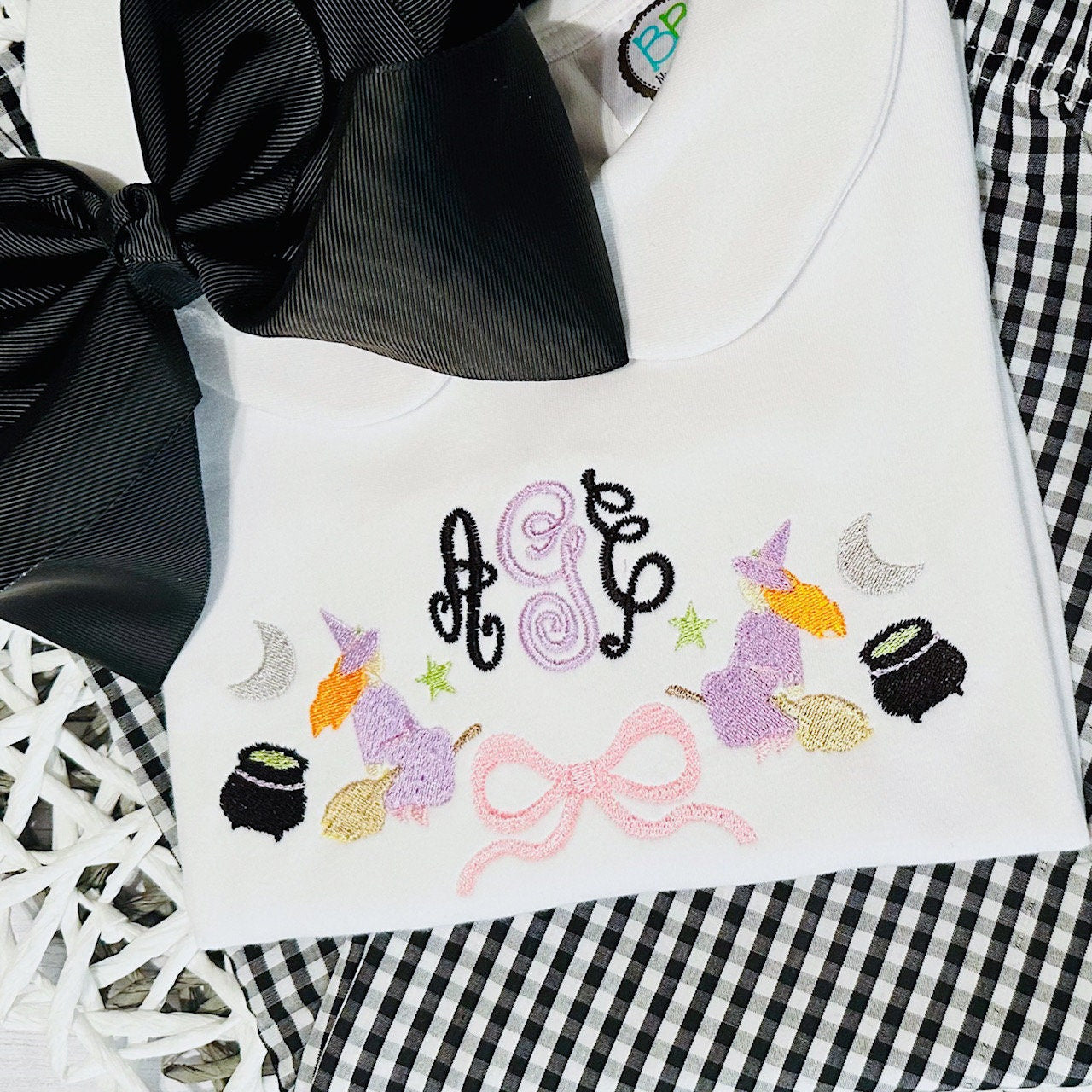 Design includes a Halloween flying witch with broomstick monogram frame machine embroidery file. Font not included.