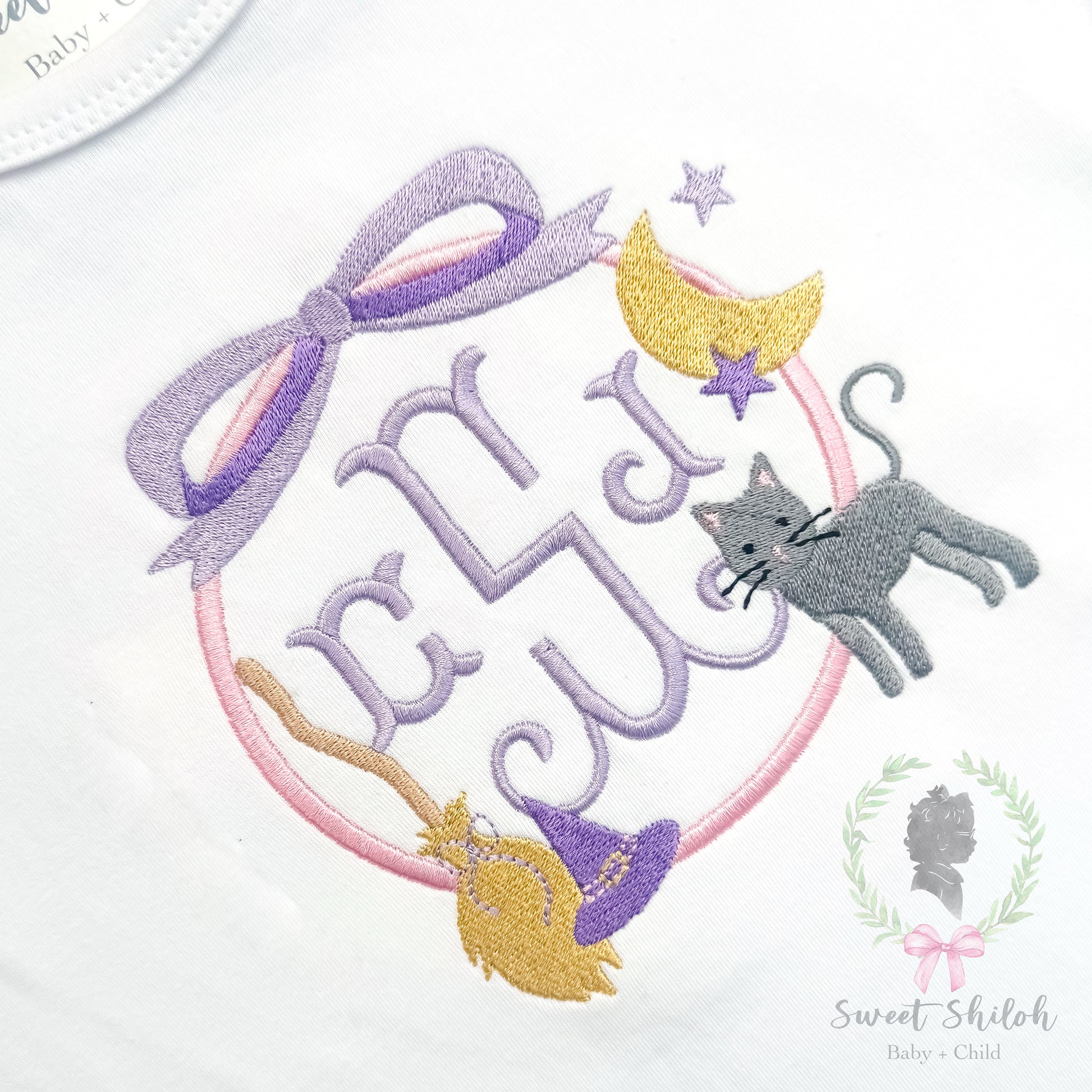 Design includes a Halloween witch kitten under moon and stars monogram frame machine embroidery file. Font not included.