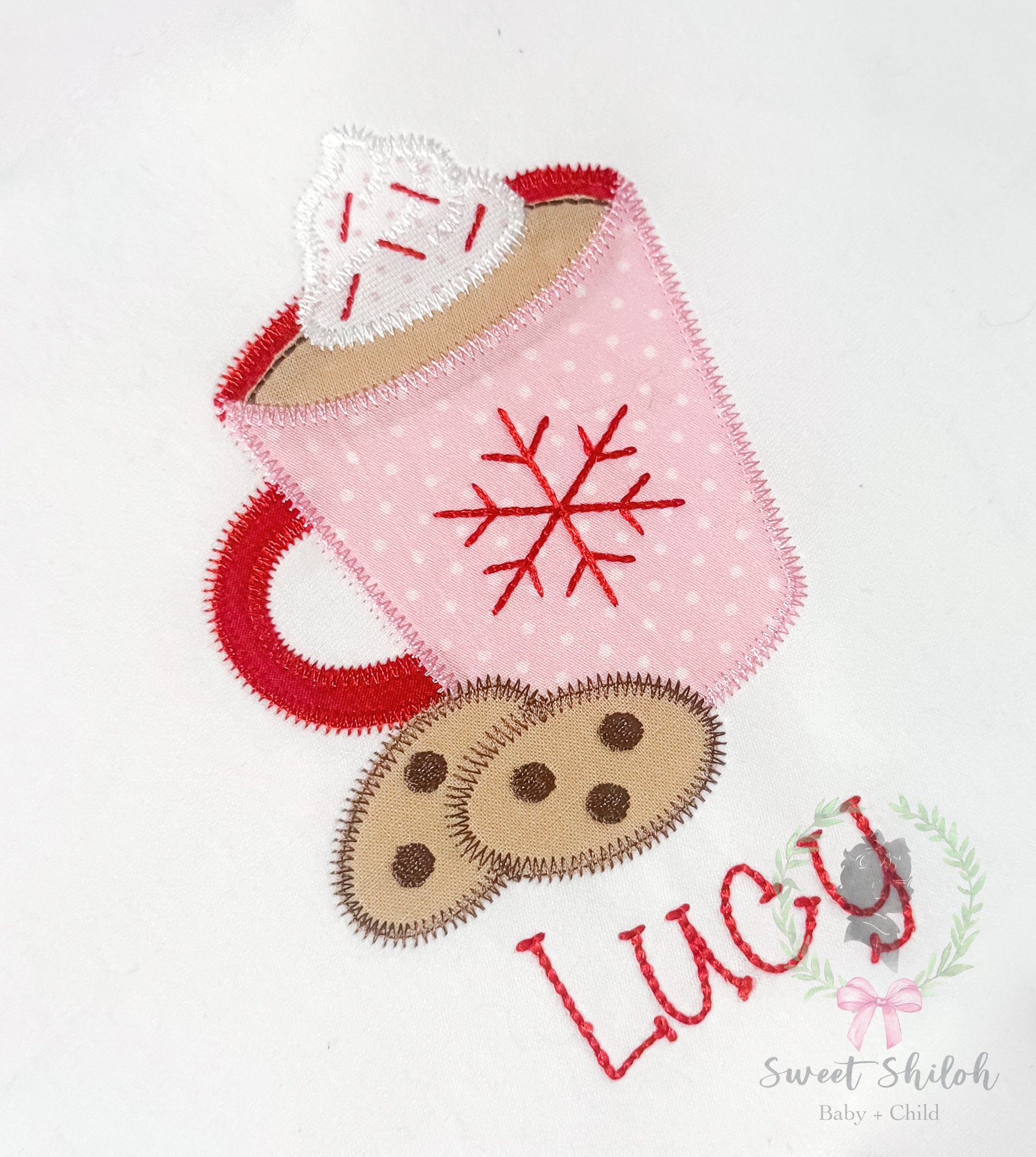 Design includes a zigzag stitch Christmas hot cocoa and cookie applique machine embroidery file. Font not included.