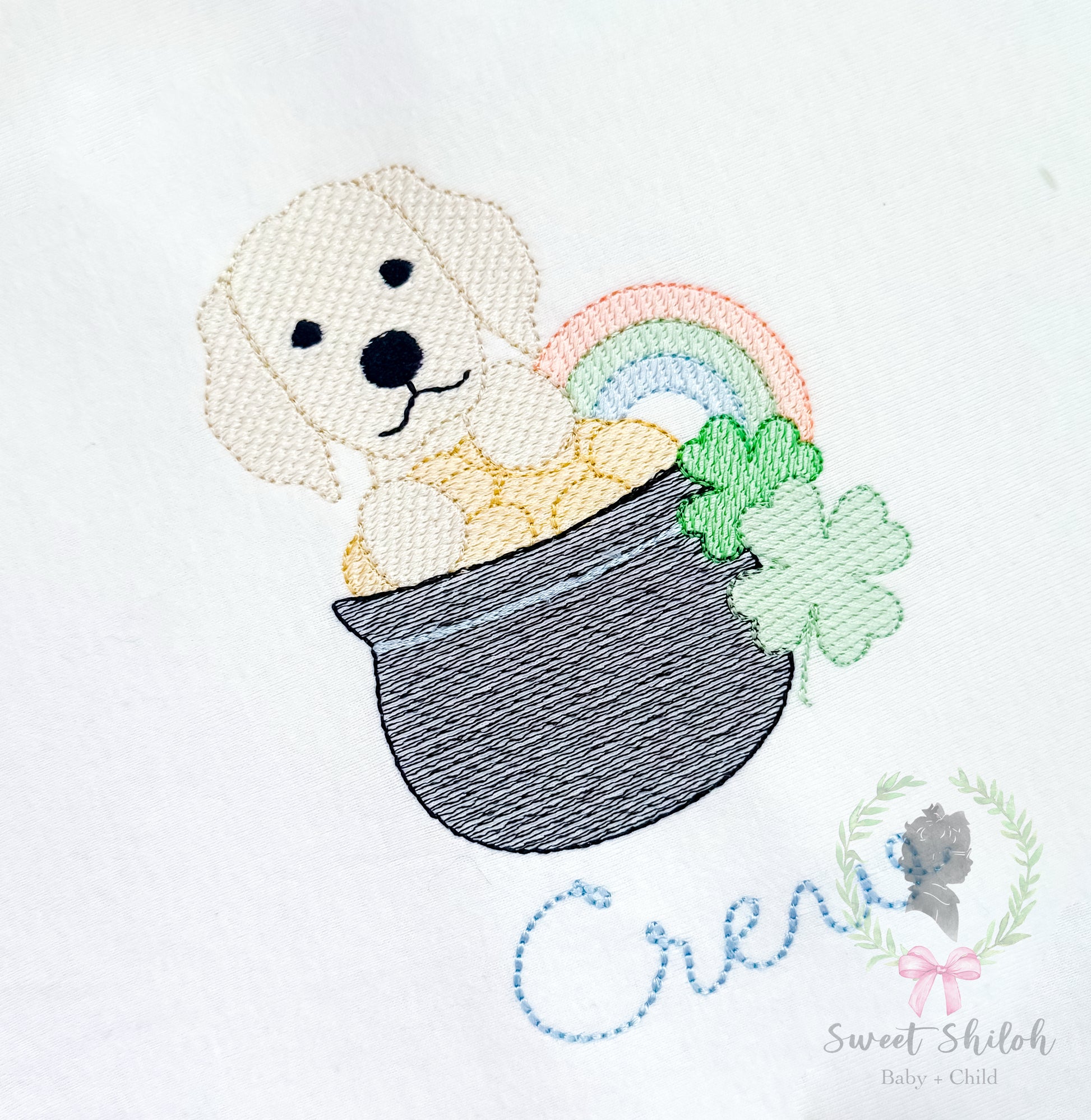 Design includes a sketch St. Patrick's Day Labrador puppy with pot of gold and rainbow machine embroidery file. Font not included.