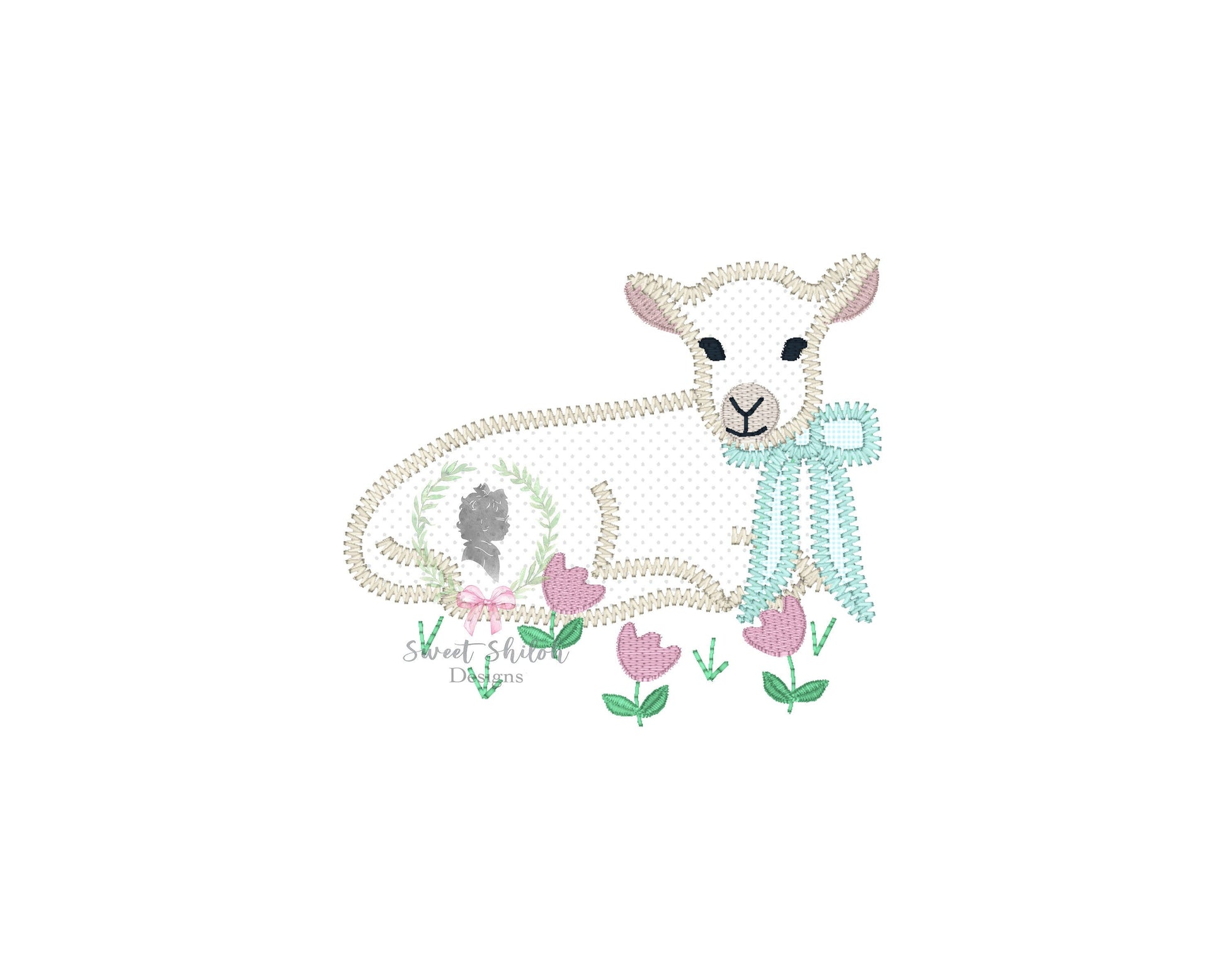 Design includes a spring lamb with flowers zigzag appliqué machine embroidery file. Font not included.