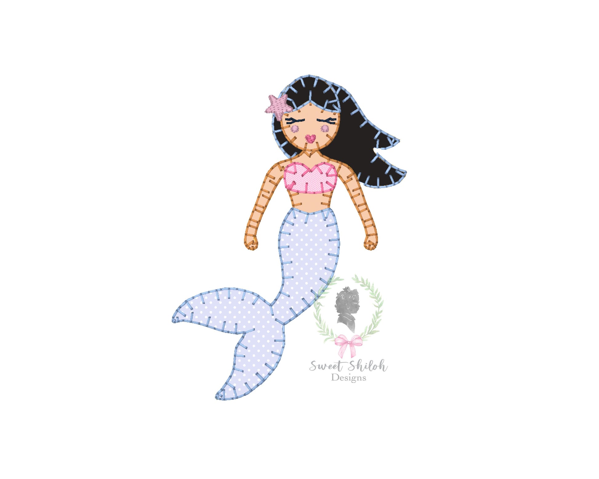 Design includes a blanket stitch fairytale mermaid applique machine embroidery file. Font not included.