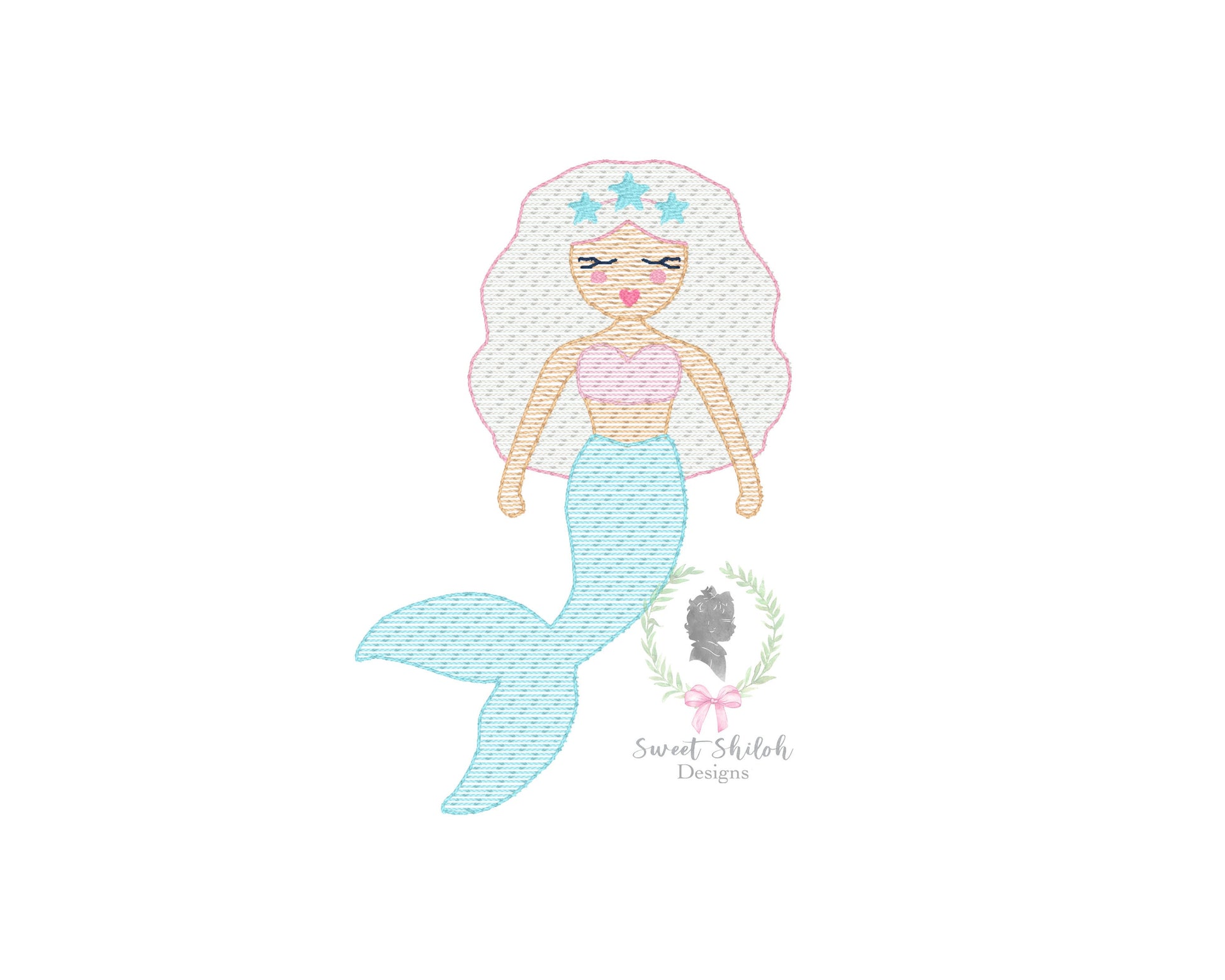 Design includes a sketch stitch fairytale princess mermaid machine embroidery file. Font not included.