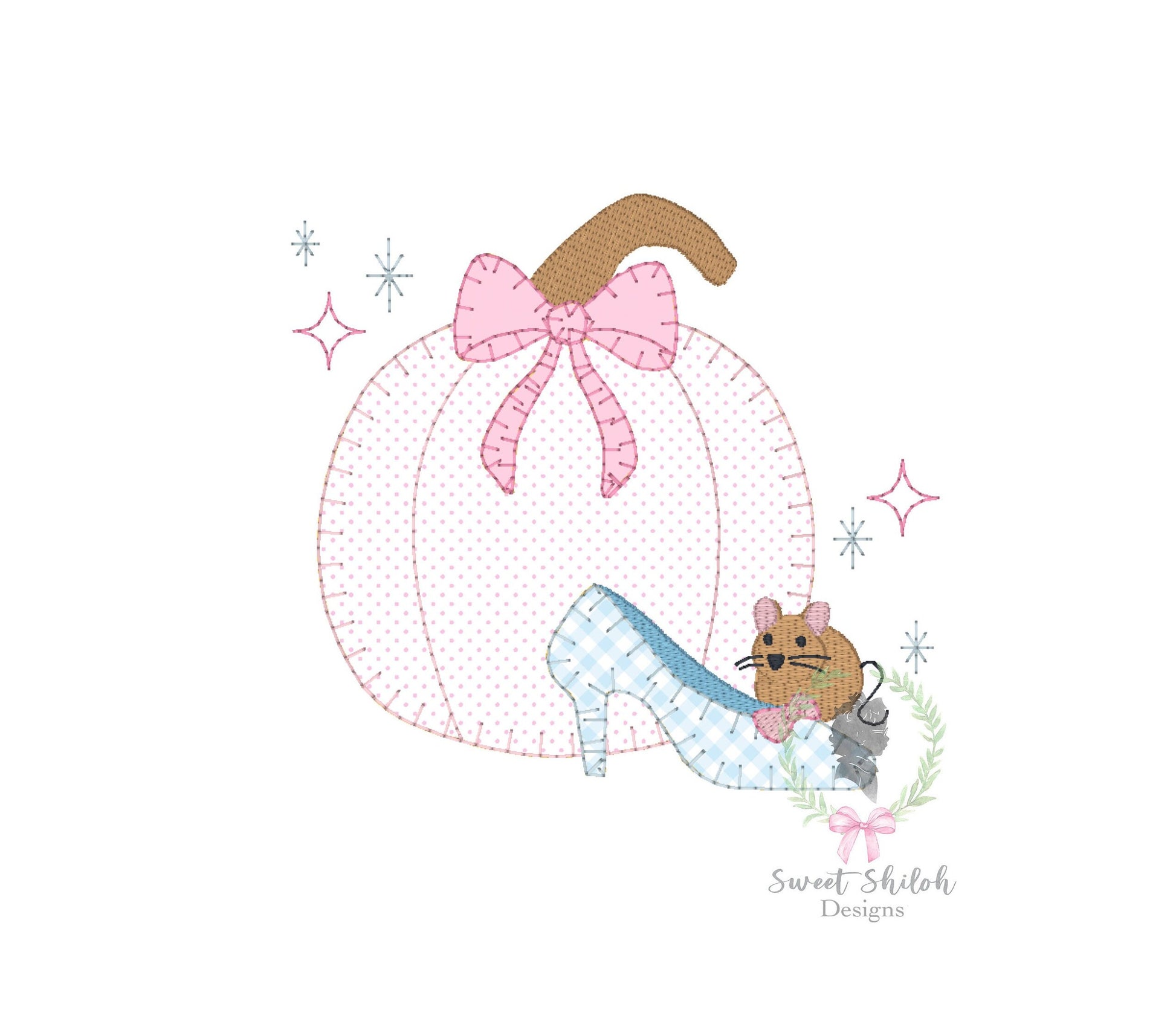 Design includes an appliqué blanket stitch fairytale princess pumpkin with glass slipper machine embroidery file. Font not included.