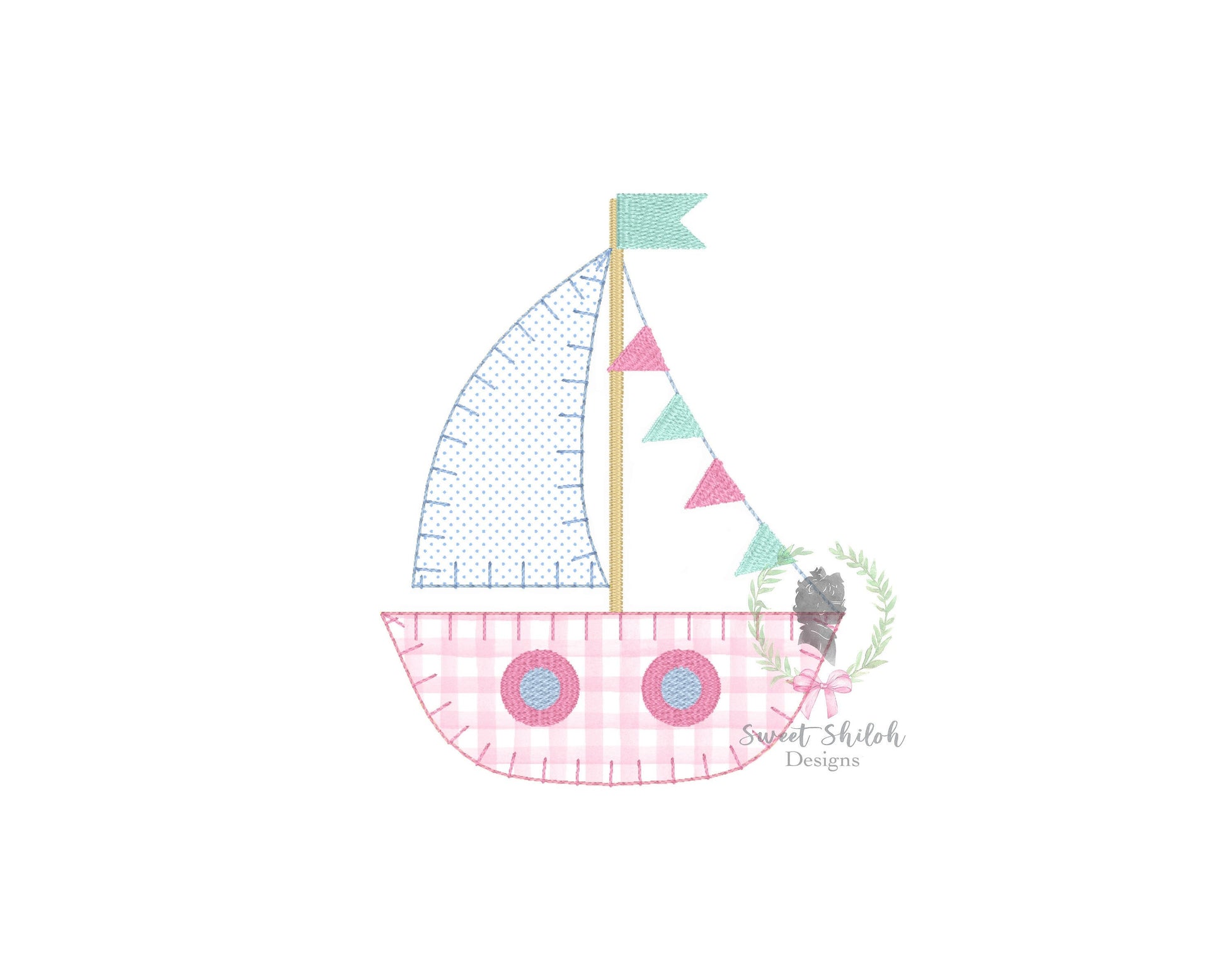 Design includes a sailboat with flag banner blanket appliqué embroidery file. Font not included.