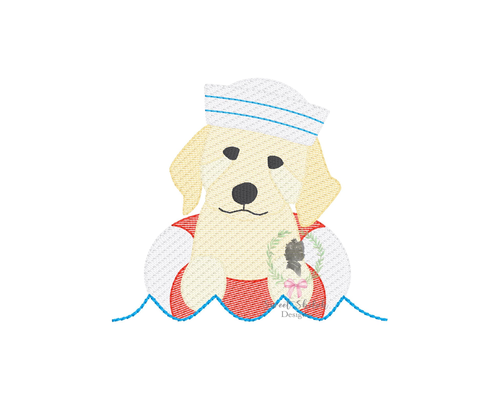 Design includes a sketch sailor goldendoodle puppy with float machine embroidery file. Font not included.