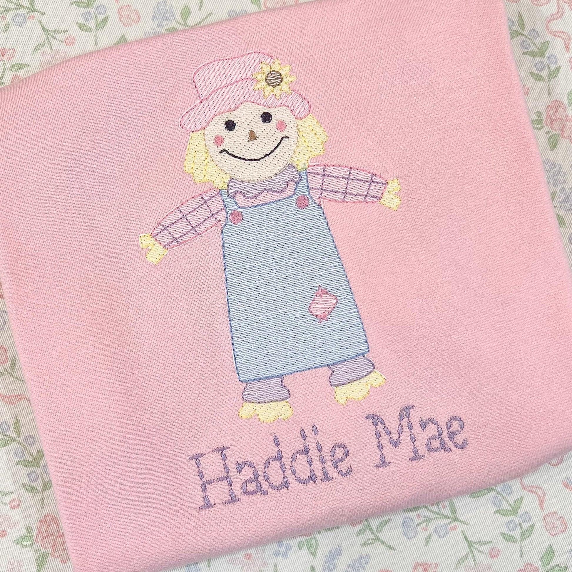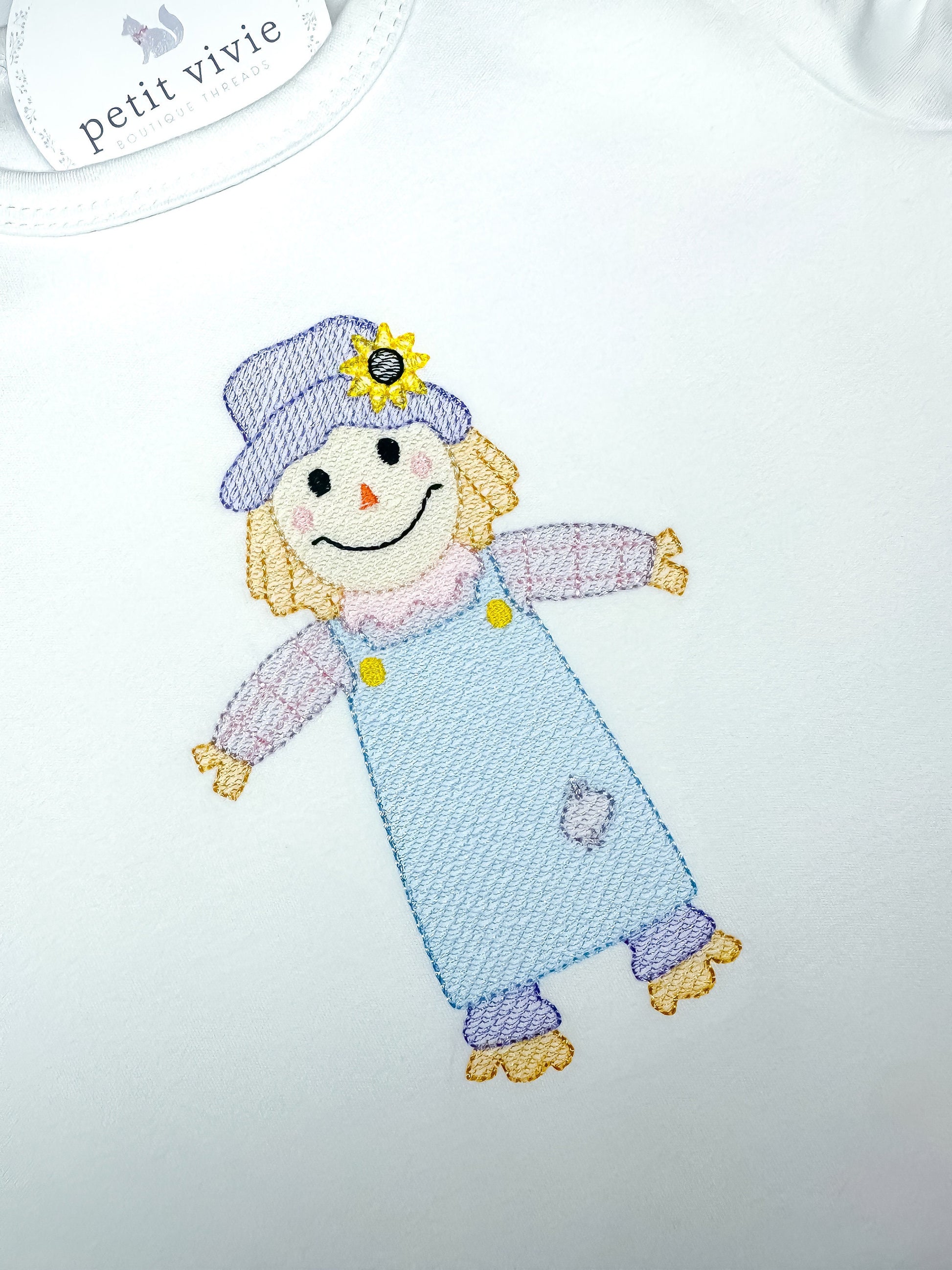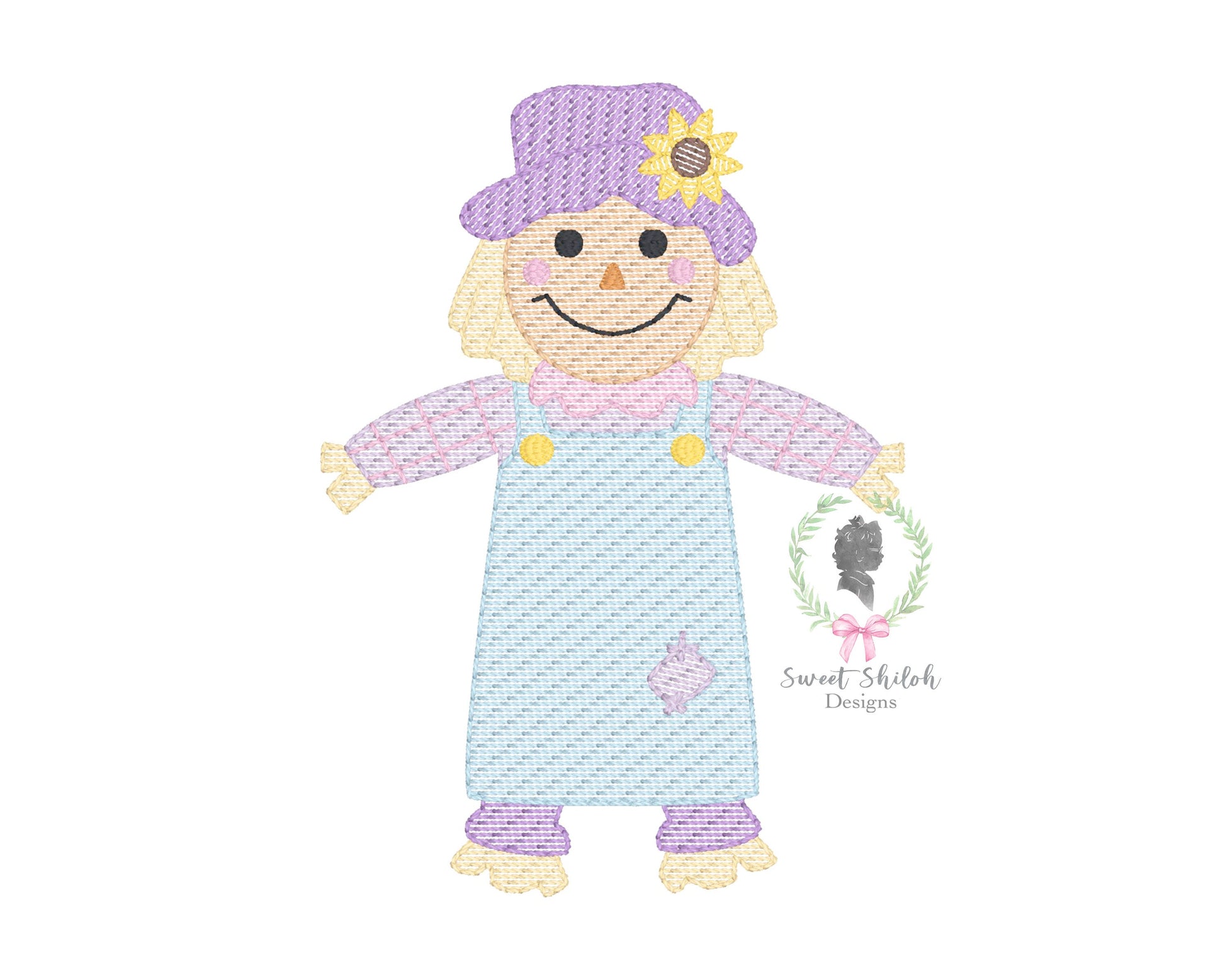 Design includes a sketch scarecrow girl machine embroidery file. Font not included.