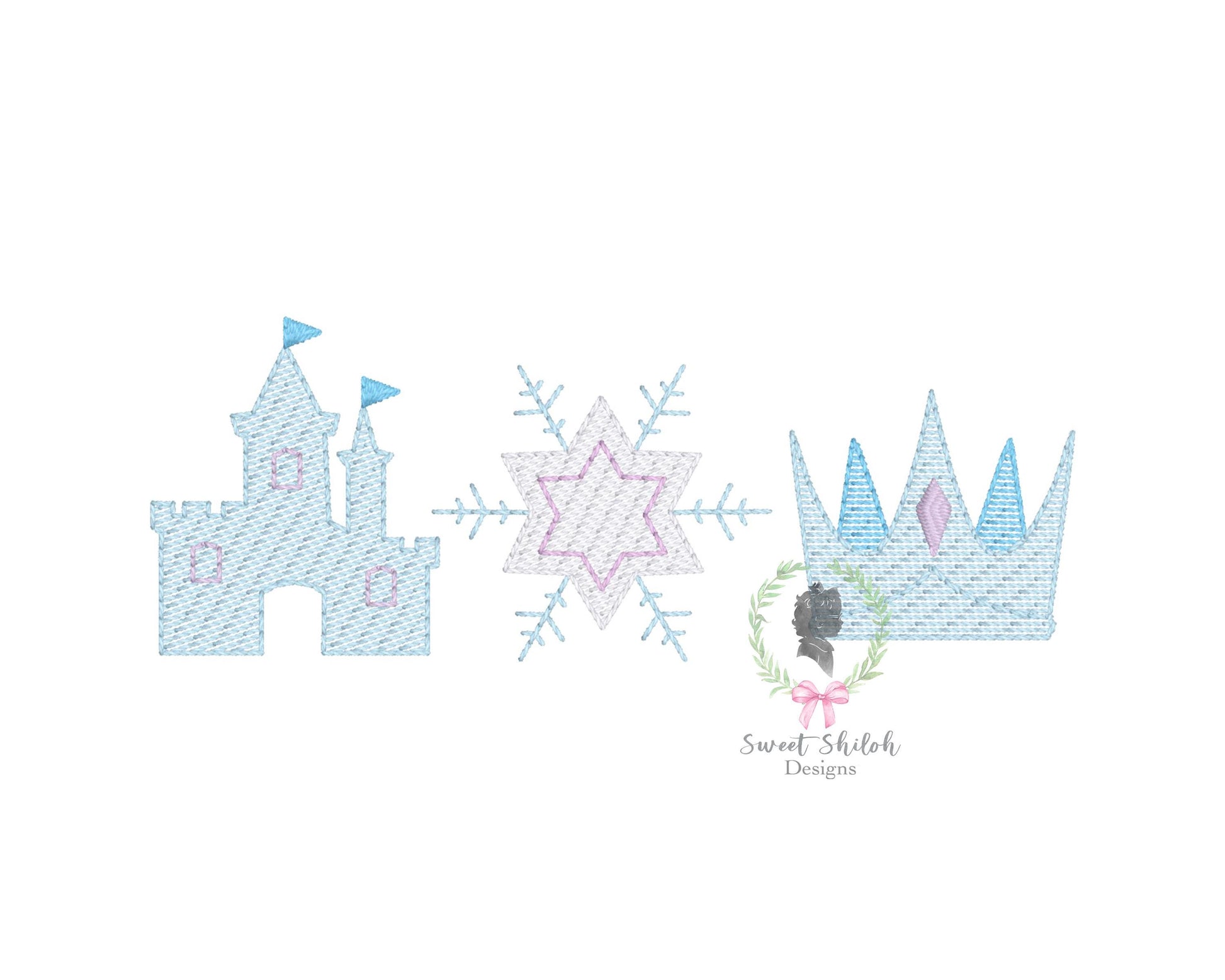 Design includes a sketch ice queen trio machine embroidery file. Font not included.