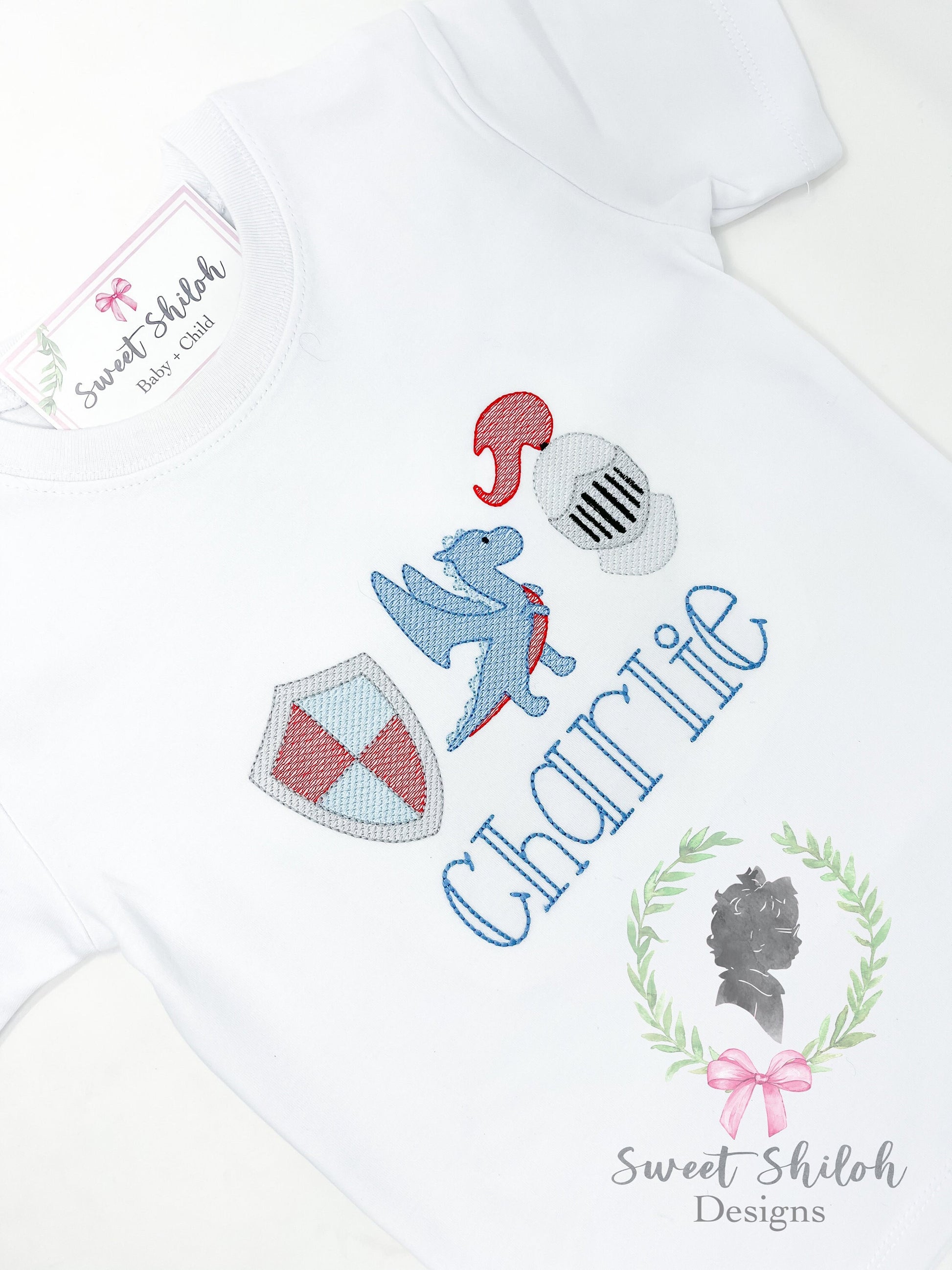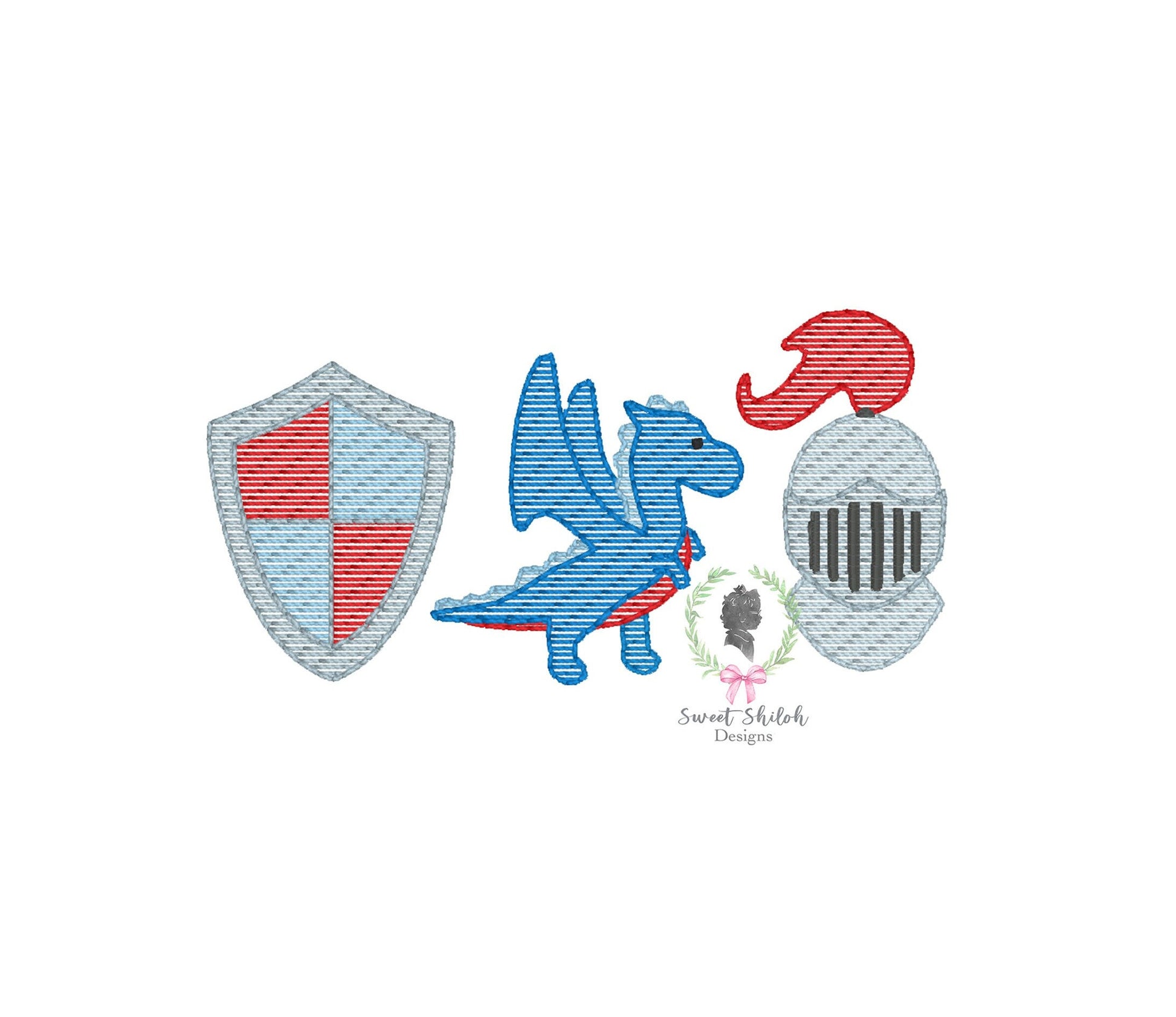 Design includes a sketch knight dragon trio machine embroidery file. Font not included.