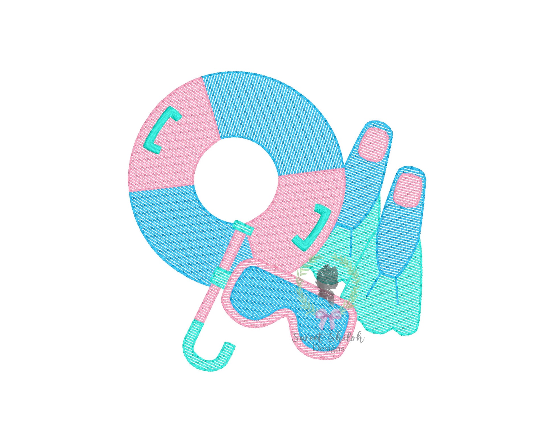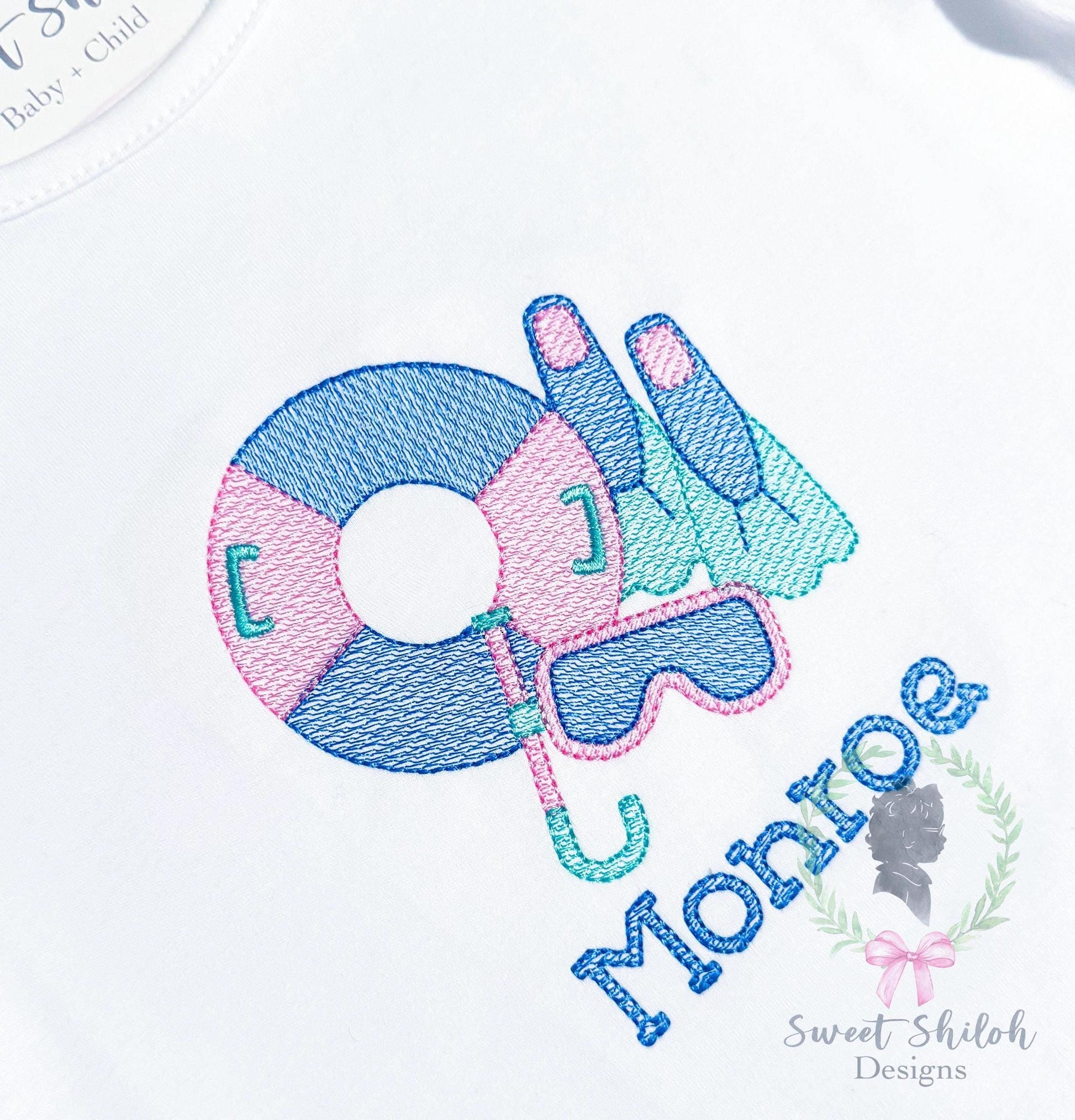 Design includes a sketch stitch float snorkel machine embroidery file. Font not included.