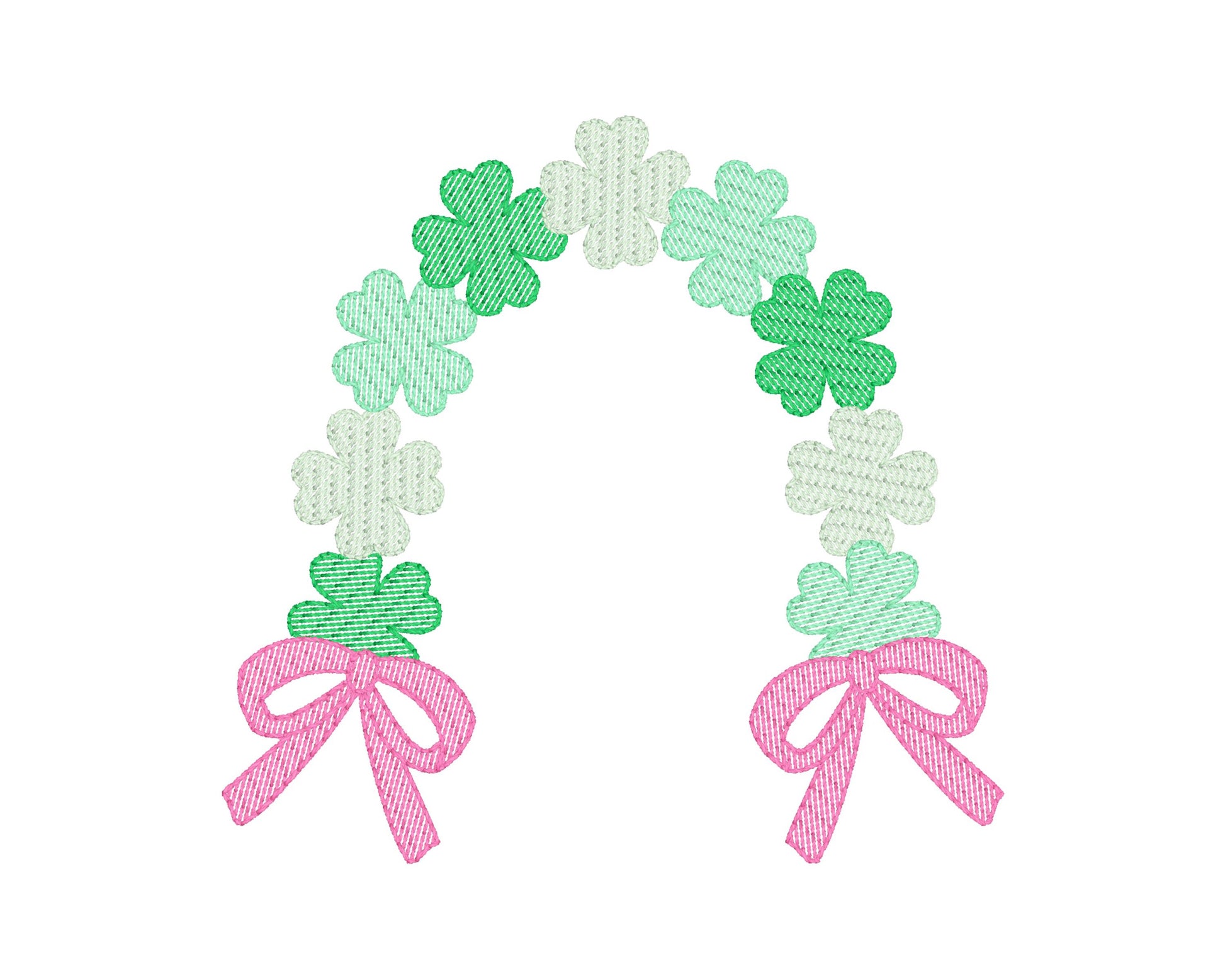 Design includes a sketch St. Patrick's Day shamrock rainbow with bows machine embroidery file. Font not included.