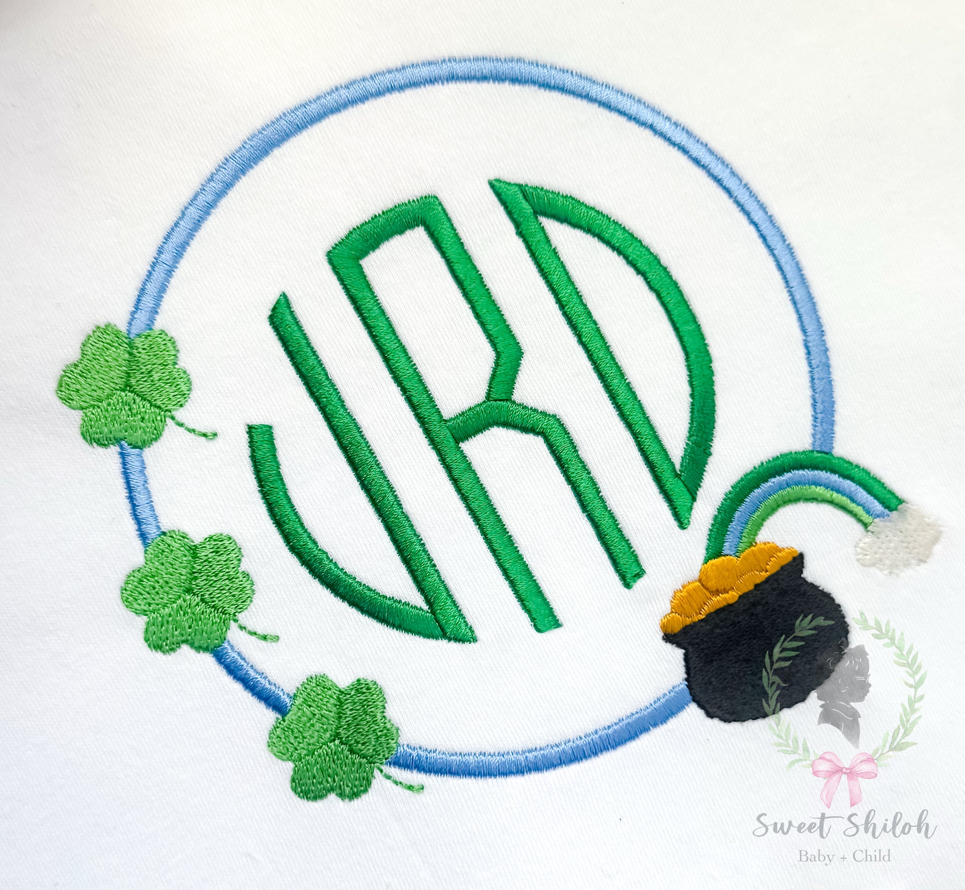 Design includes a fill St. Patrick's Day rainbow pot of gold monogram frame machine embroidery file. Font not included.