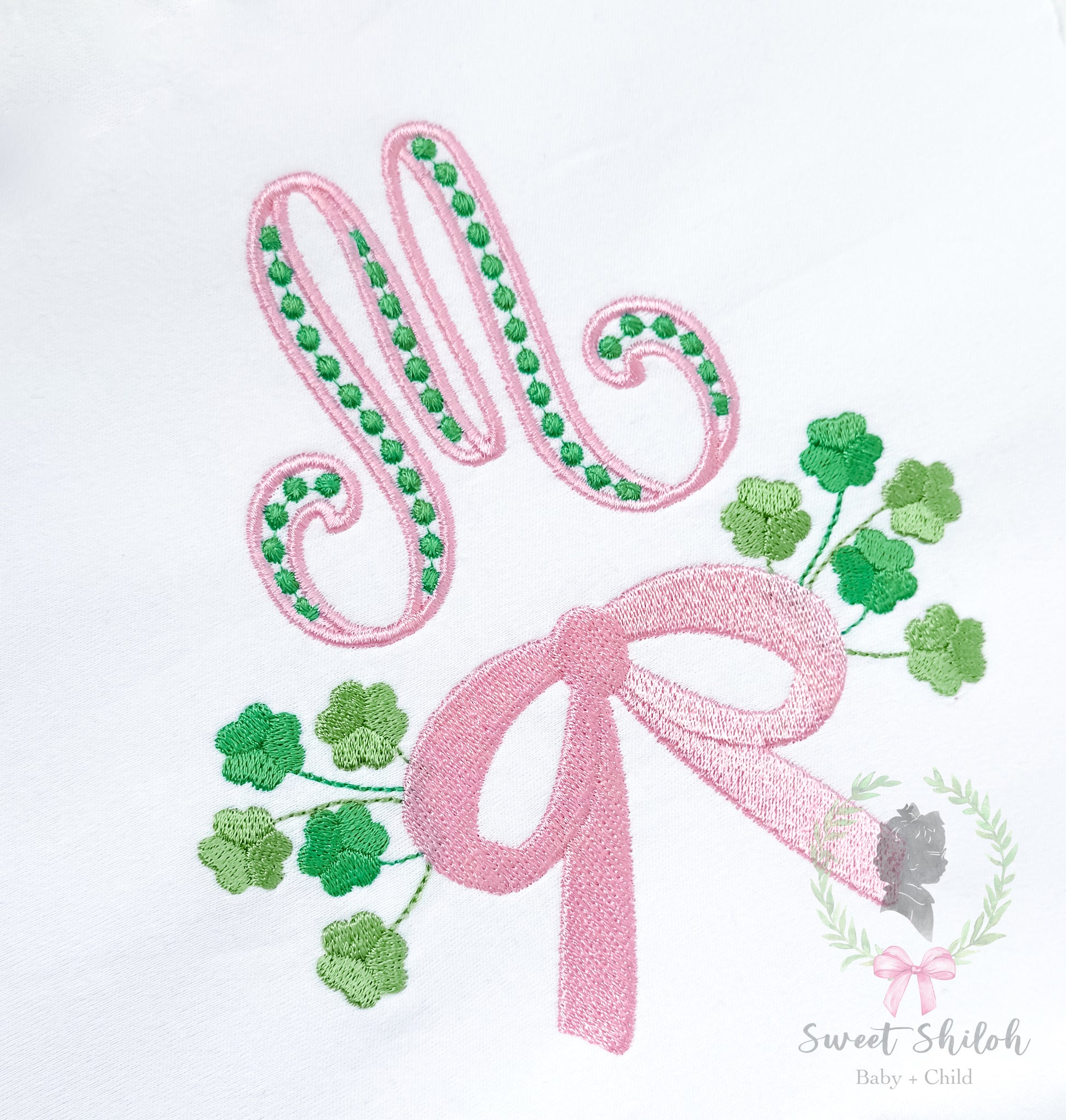 Design includes a fill St. Patrick's Day shamrock clover frame with bow machine embroidery file. Font not included.