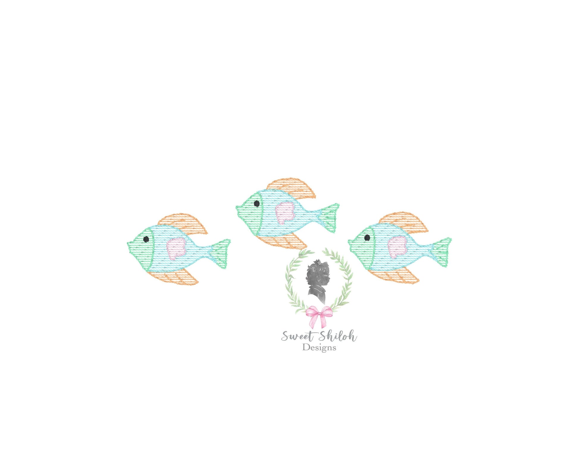 Design includes a sketch swimming fish trio machine embroidery file. Font not included.