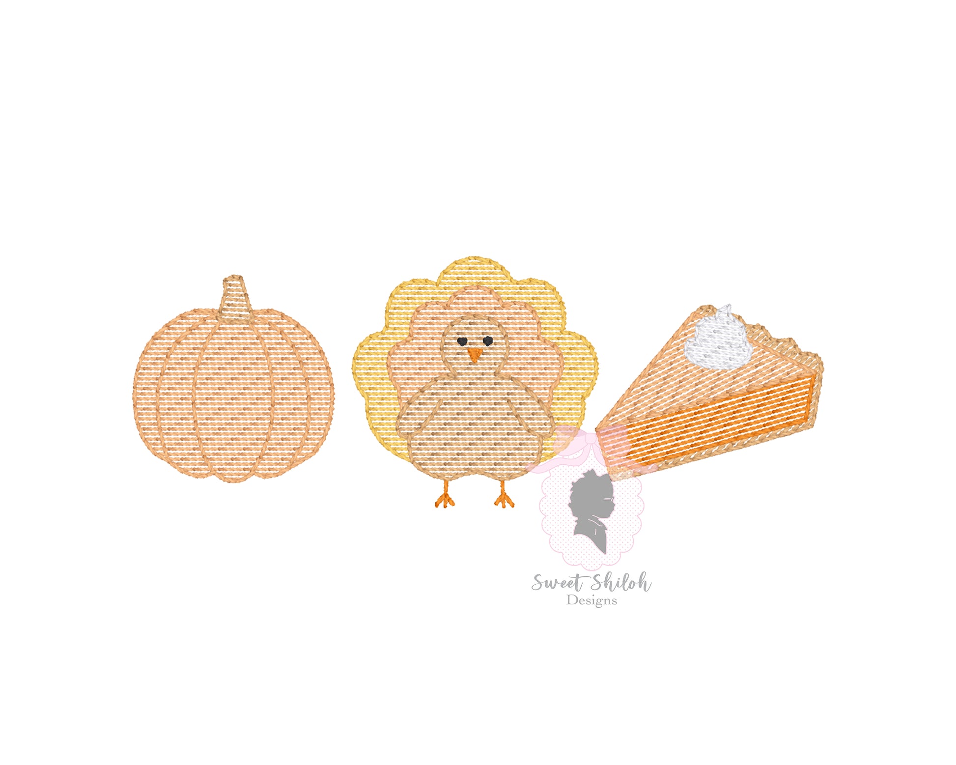 Design includes a sketch stitch thanksgiving trio machine embroidery file. Fonts not included.