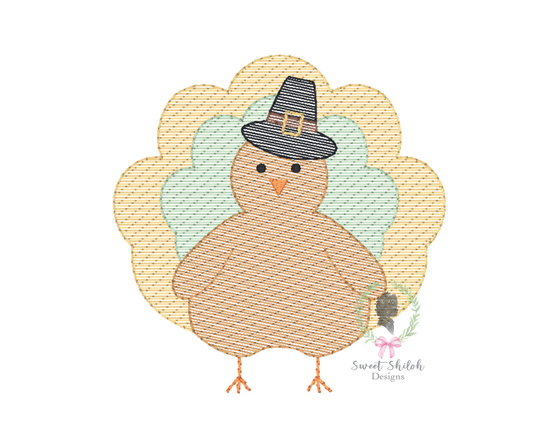 Design includes a sketch stitch pilgrim turkey machine embroidery file. Fonts not included.