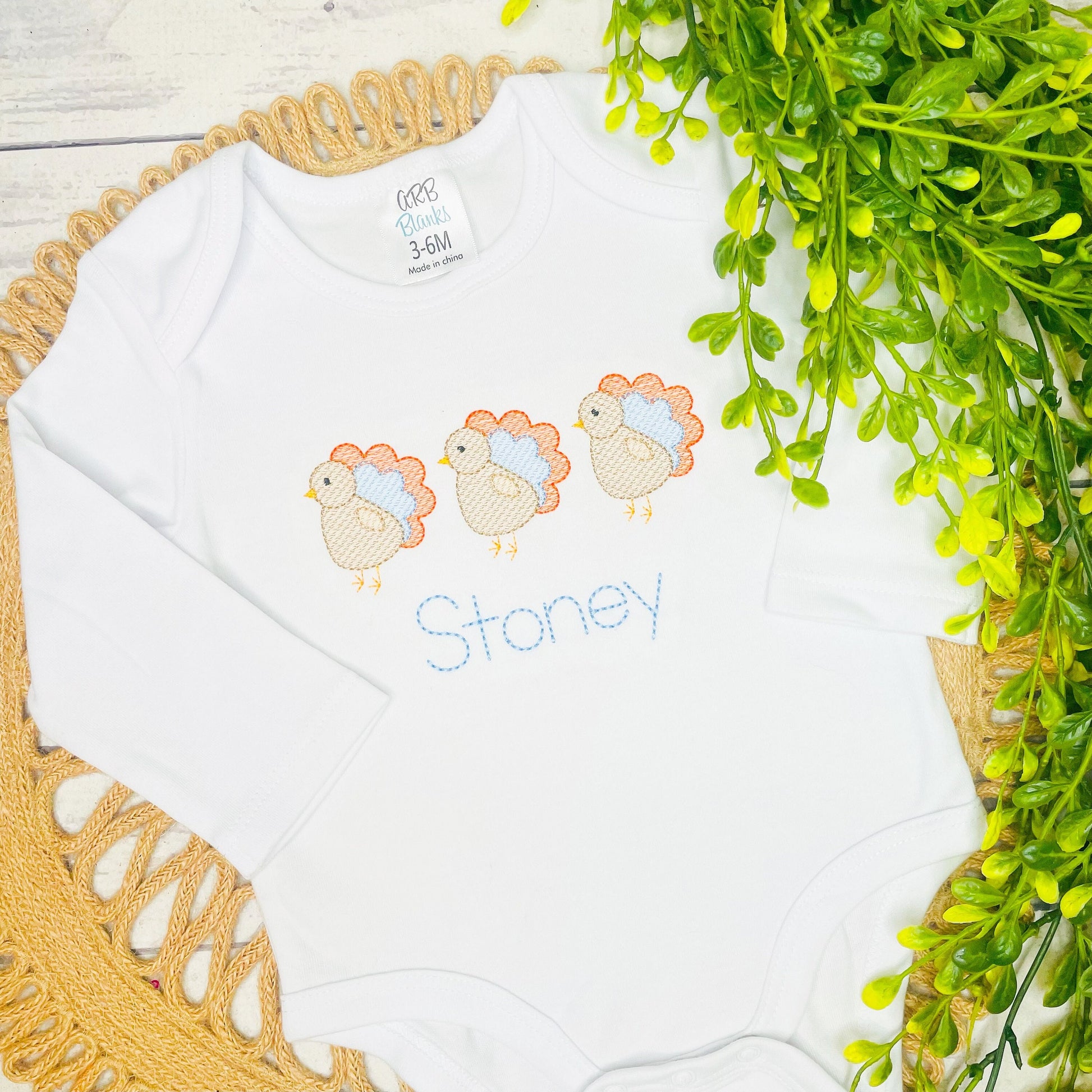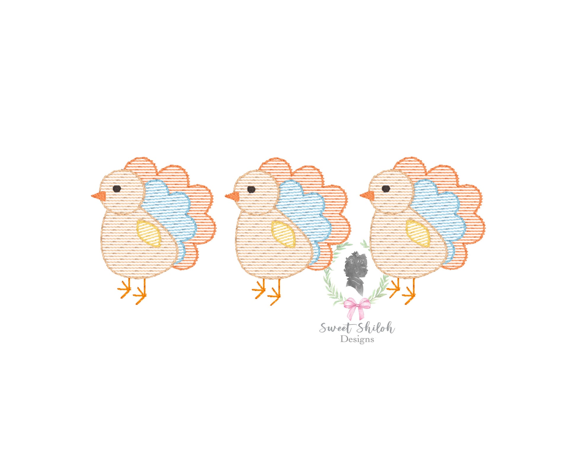 Design includes a sketch stitch turkey trio machine embroidery file. Fonts not included.