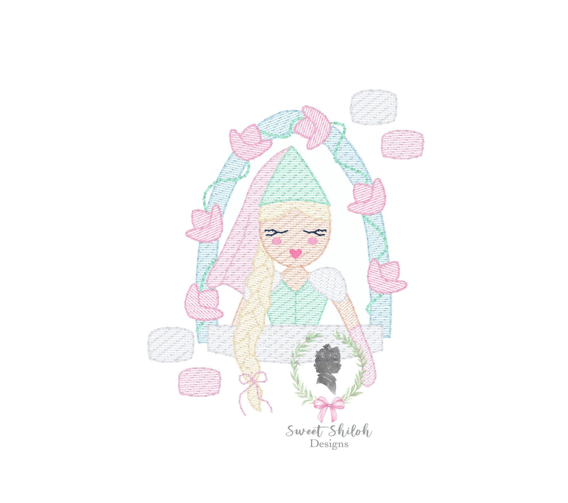 Design includes a fairytale tower princess sketch machine embroidery file. Font not included.