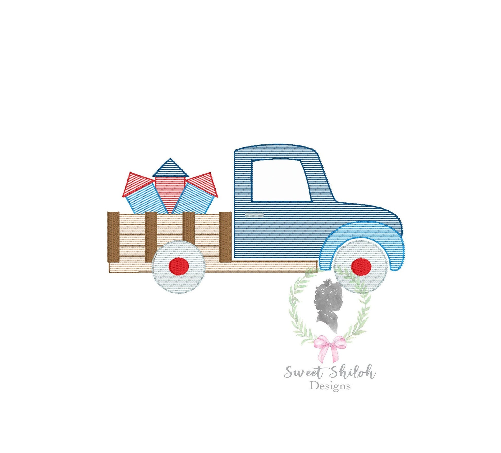 Design includes a sketch farm truck with rockets machine embroidery file. Fonts not included.