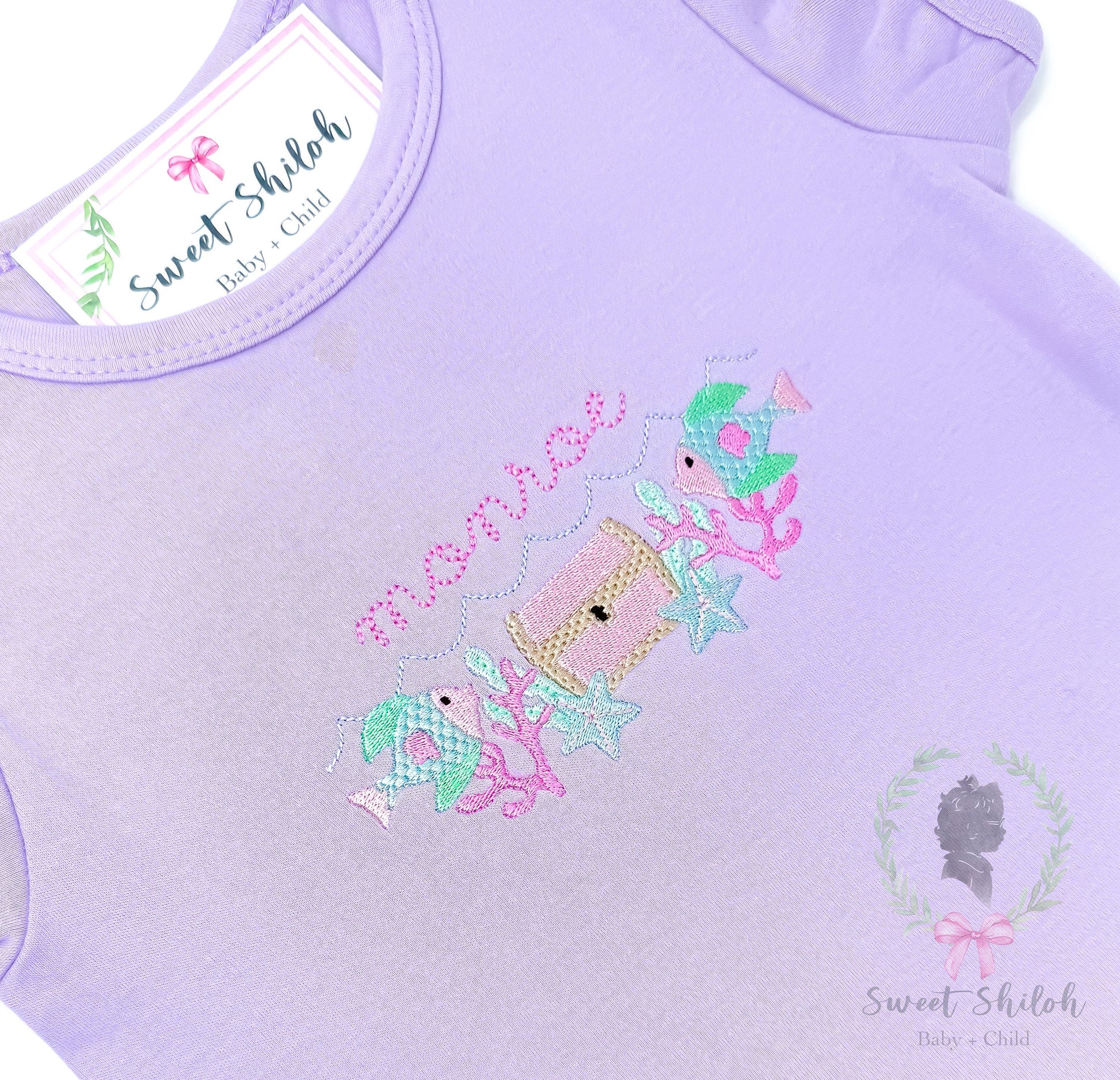 Design includes a fill stitch underwater fish monogram frame machine embroidery file. Font not included.
