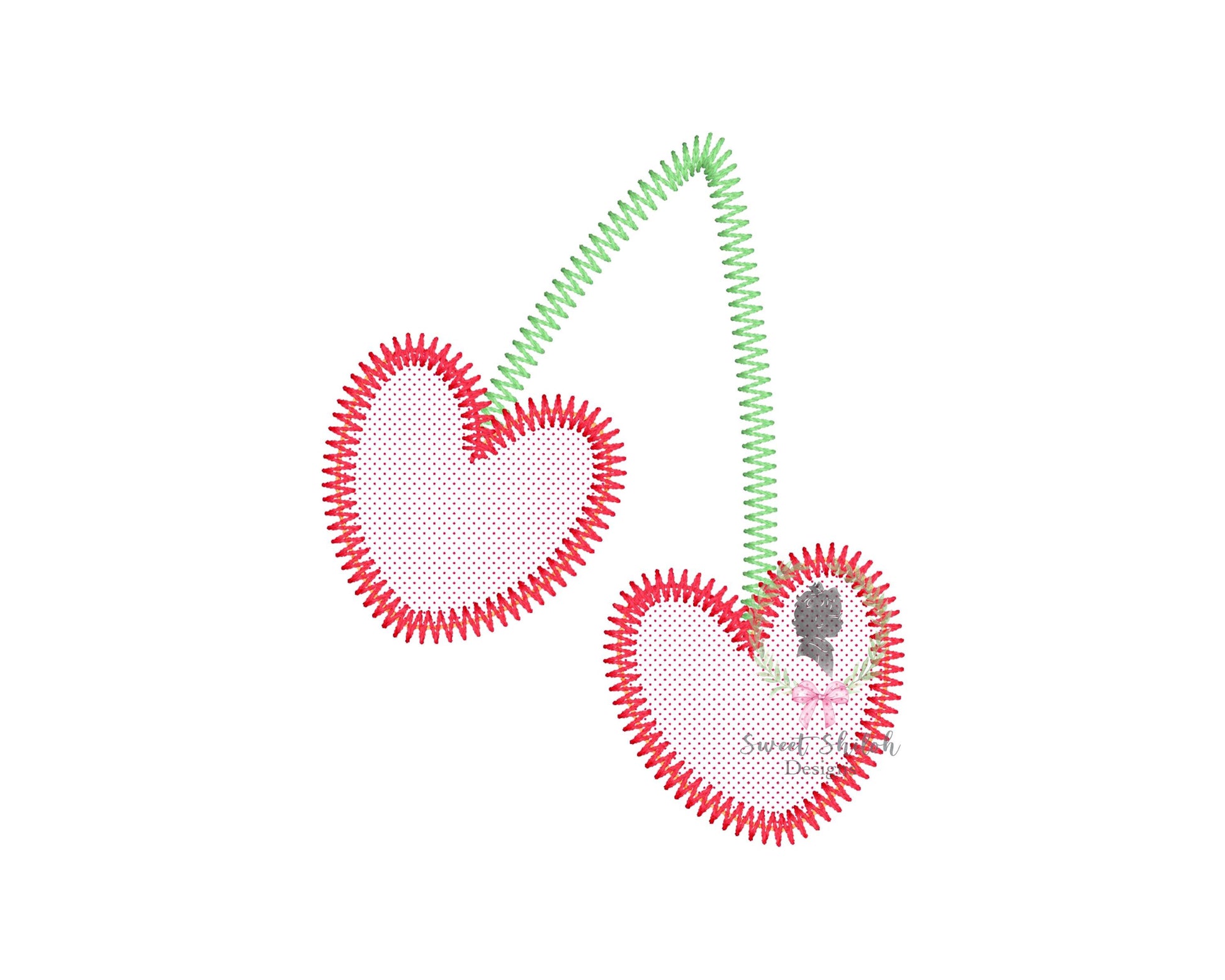 Design includes a Valentine's Day zigzag stitch heart cherry appliqué machine embroidery file. Font not included.