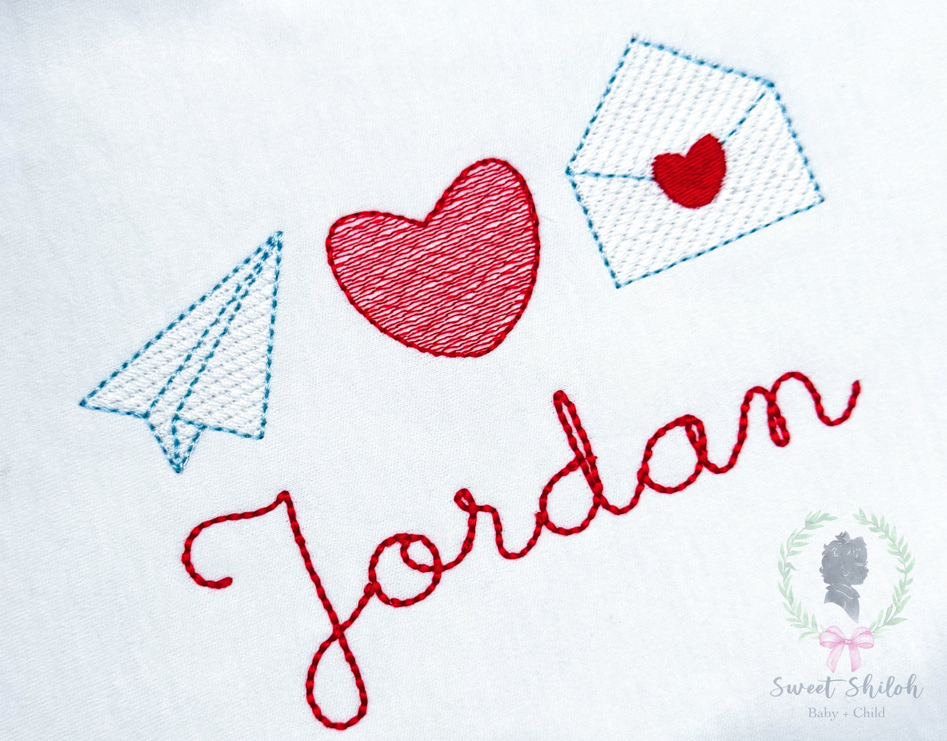 Design includes a sketch Valentine's Day trio with paper airplane, heart and love letter machine embroidery file. Font not included.