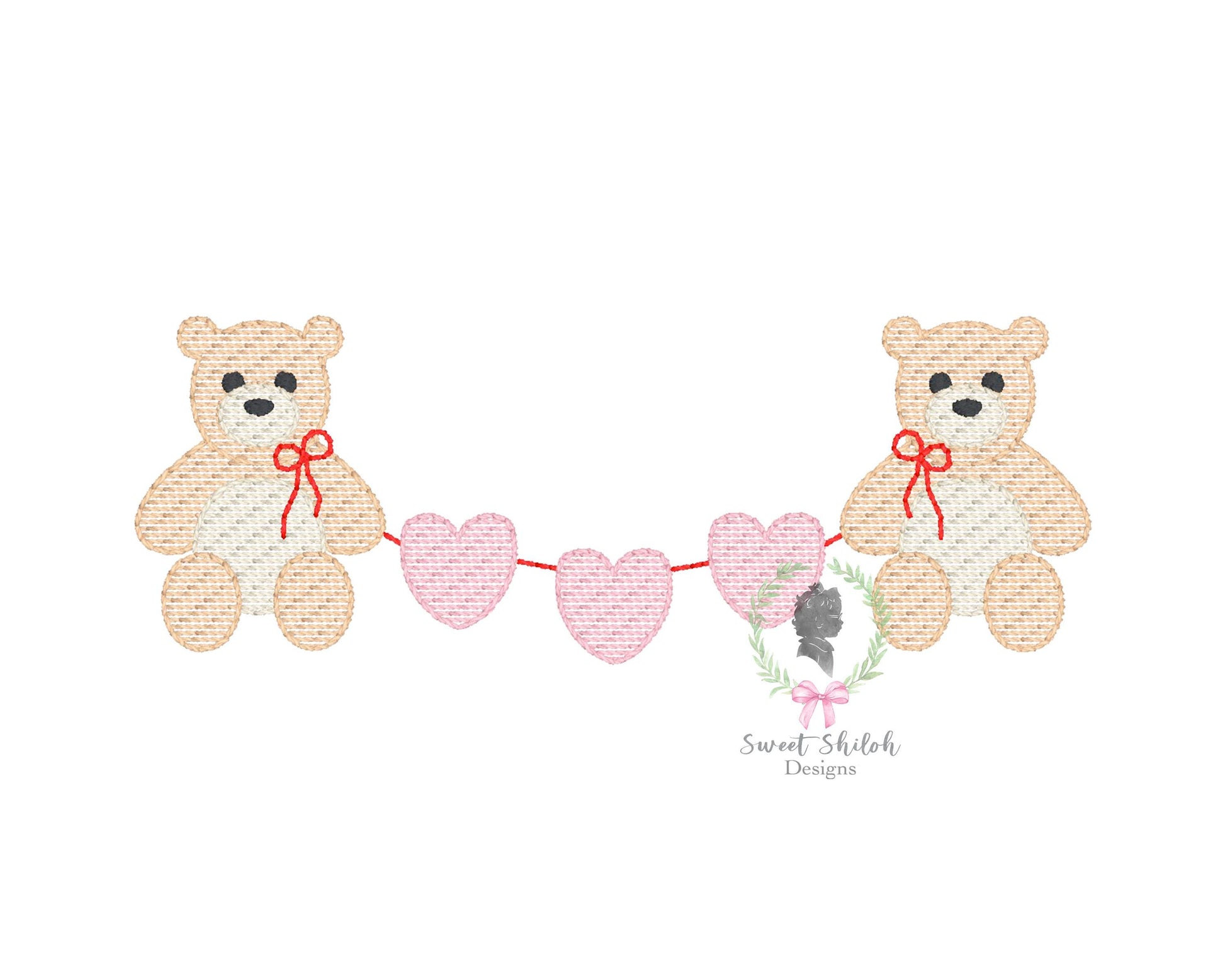 Design includes a Valentine's Day teddy bear bunting sketch frame machine embroidery file. Font not included.