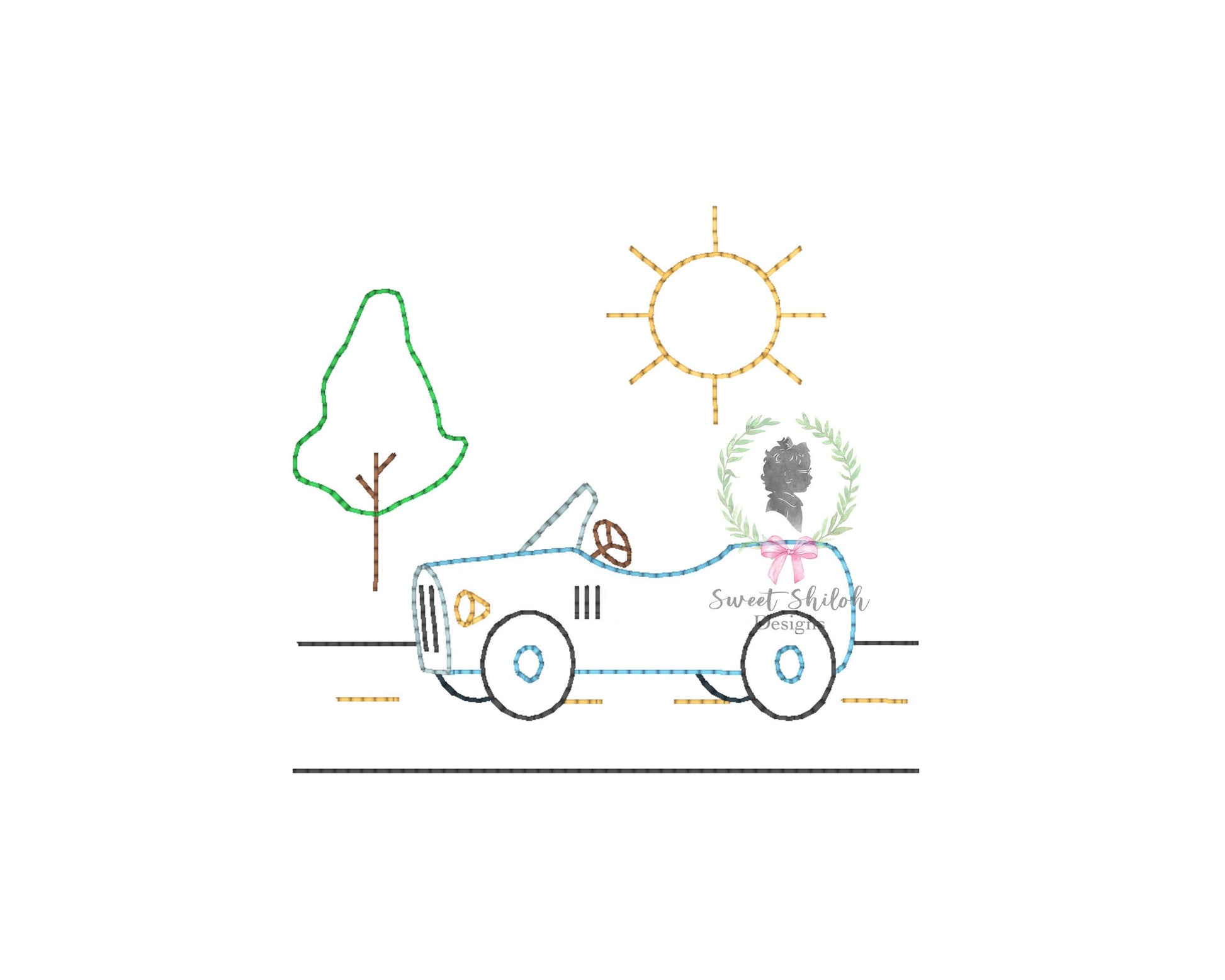 Design includes a bean stitch vintage car machine embroidery file. Font not included.