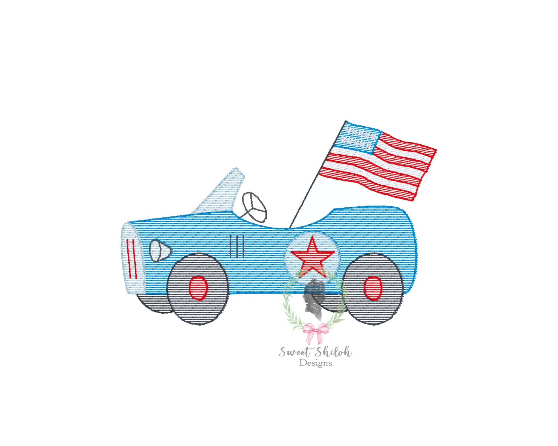 Design includes a sketch 4th of July vintage car with flag machine embroidery file. Font not included.