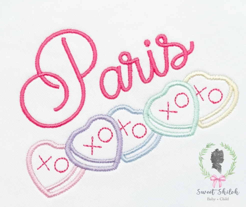 Design includes a satin outline Valentine's Day heart candy monogram frame machine embroidery file. Font not included.